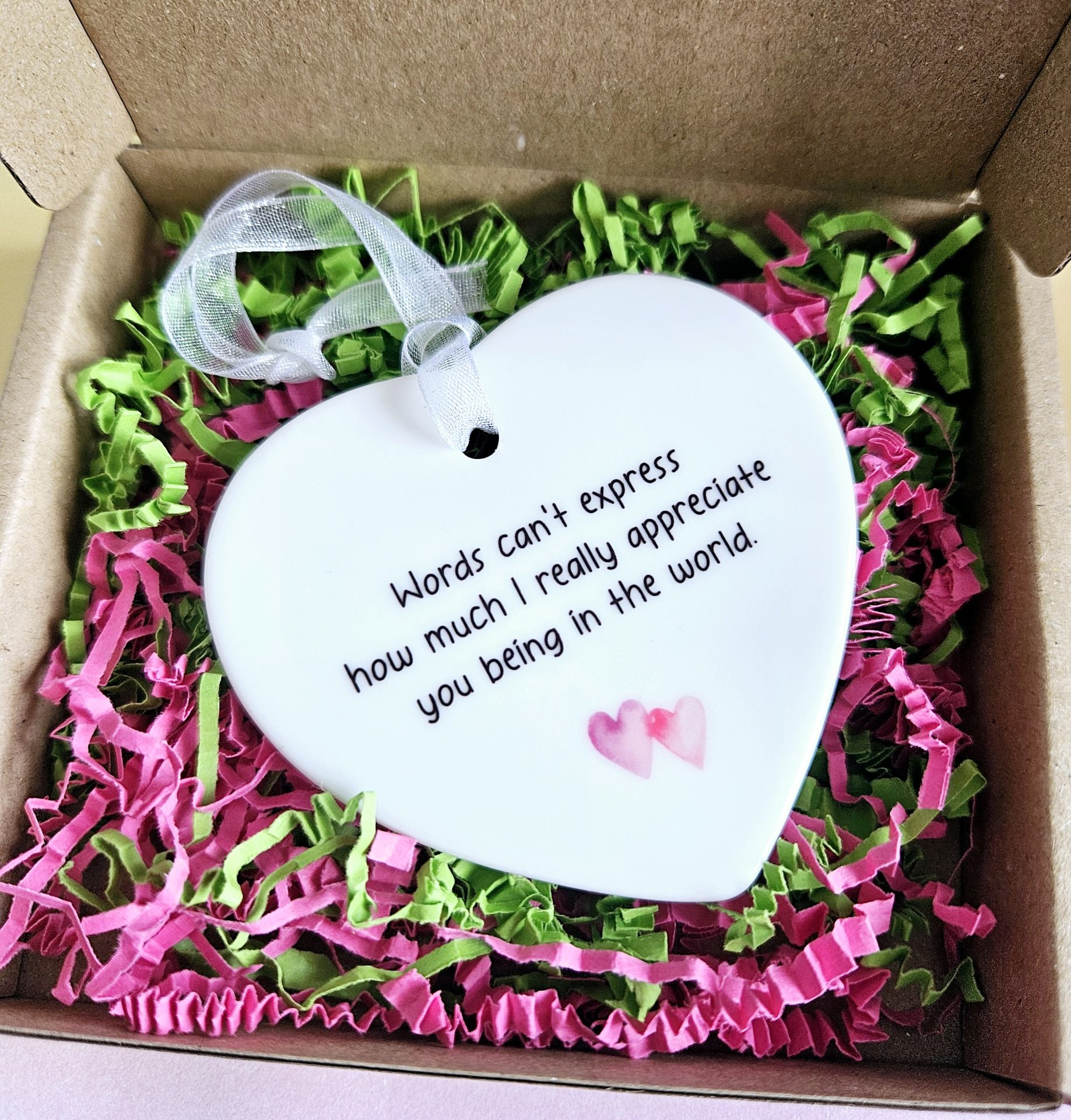 It will come with a twine, pink or white organza hanging loop and then will be placed inside a white organza pull string gift bag to make your gift that extra special.