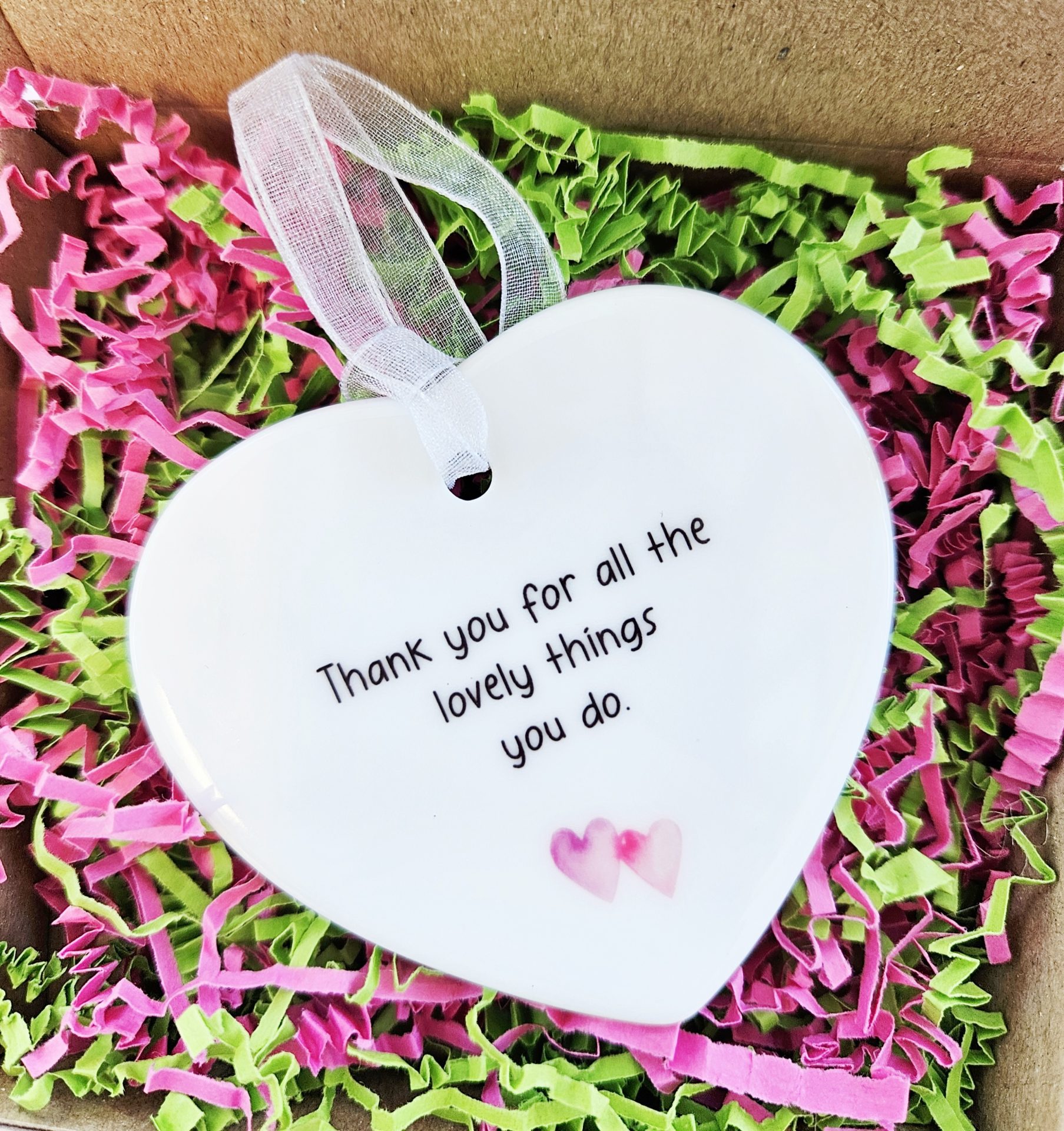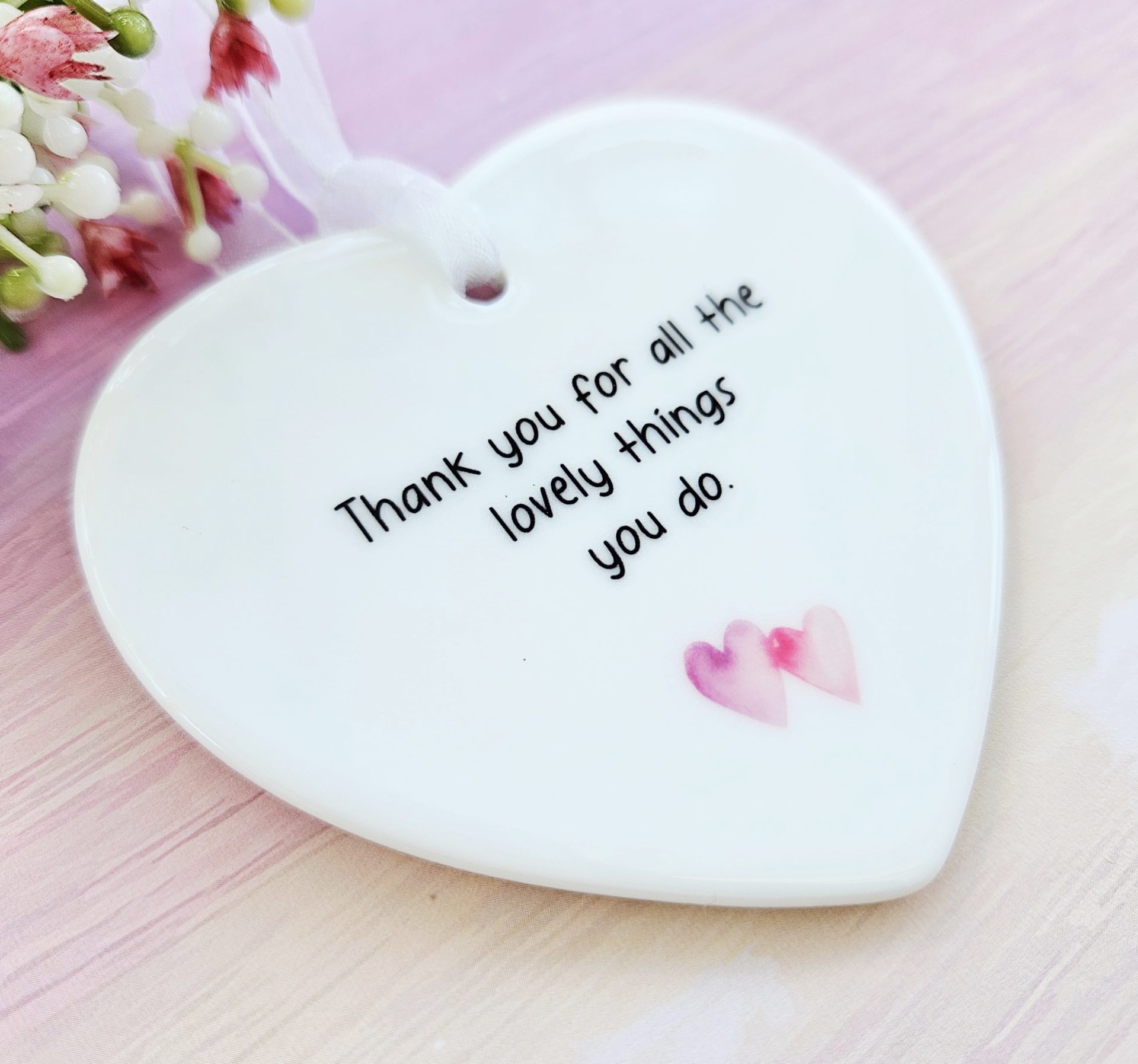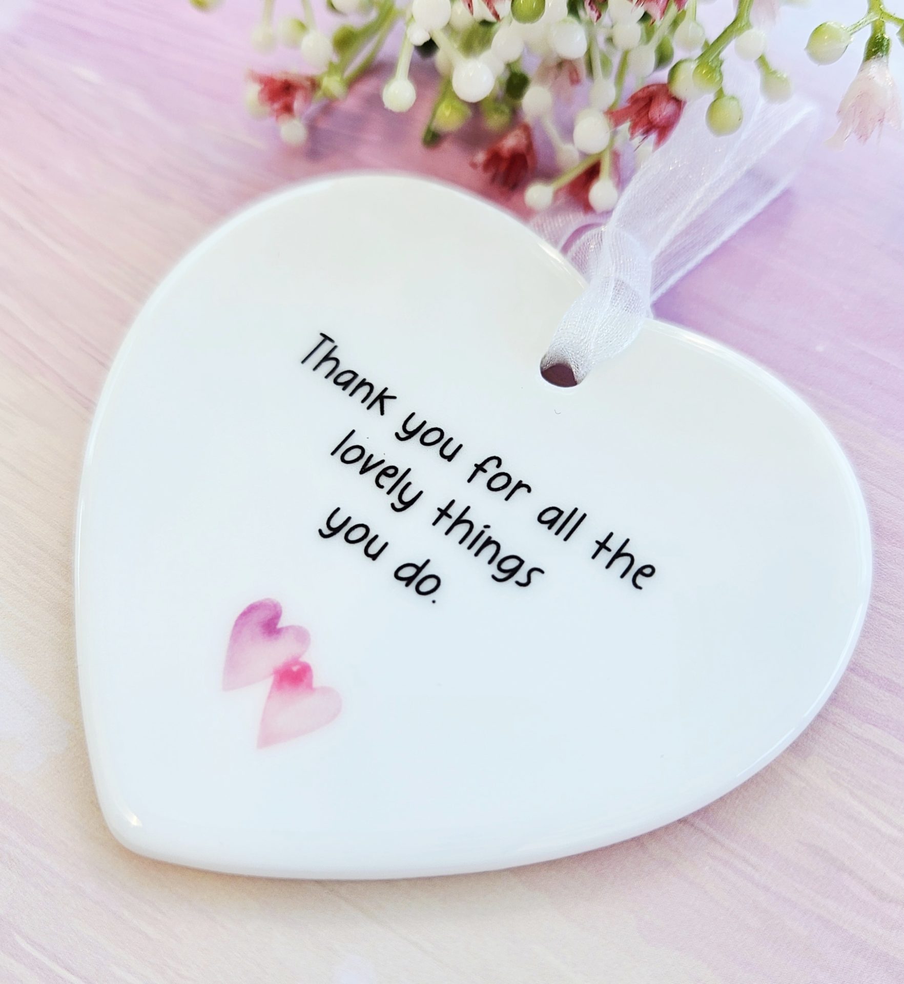 Show your gratitude with this handmade ceramic heart keepsake featuring the heartfelt message: “Thank you for all the lovely things you do.” Thoughtfully crafted, this charming decoration makes a lasting token of appreciation that your loved one can treasure for years.