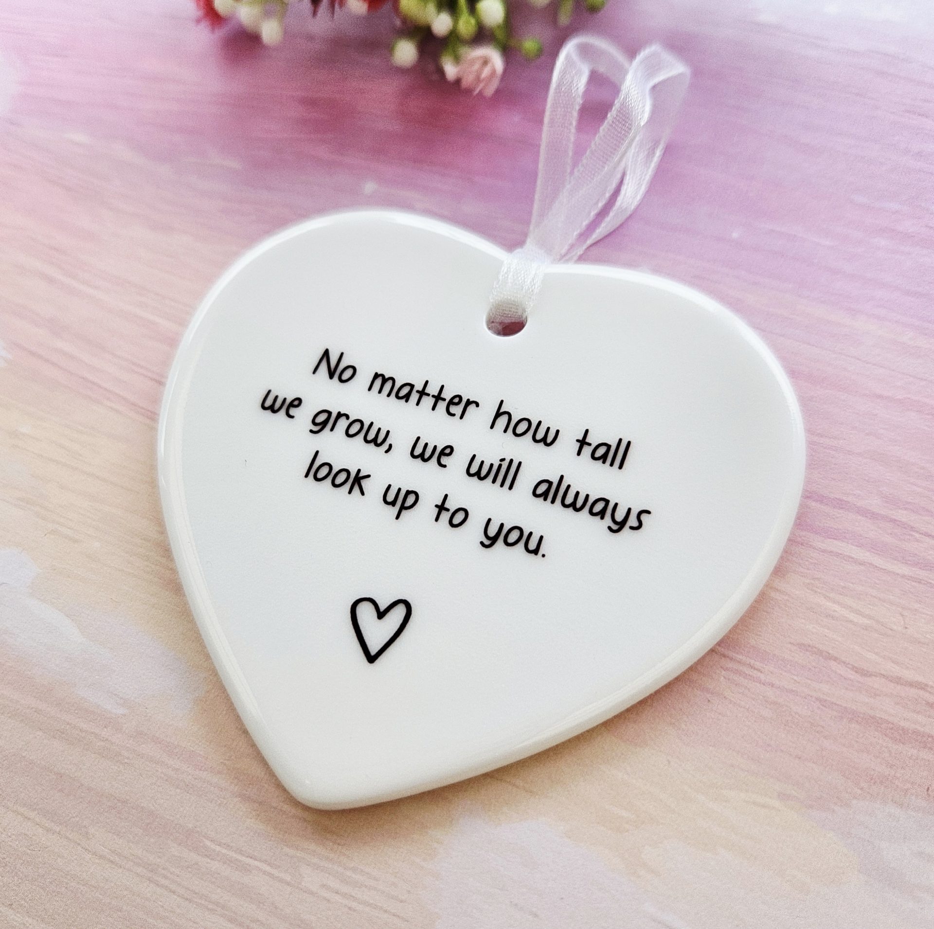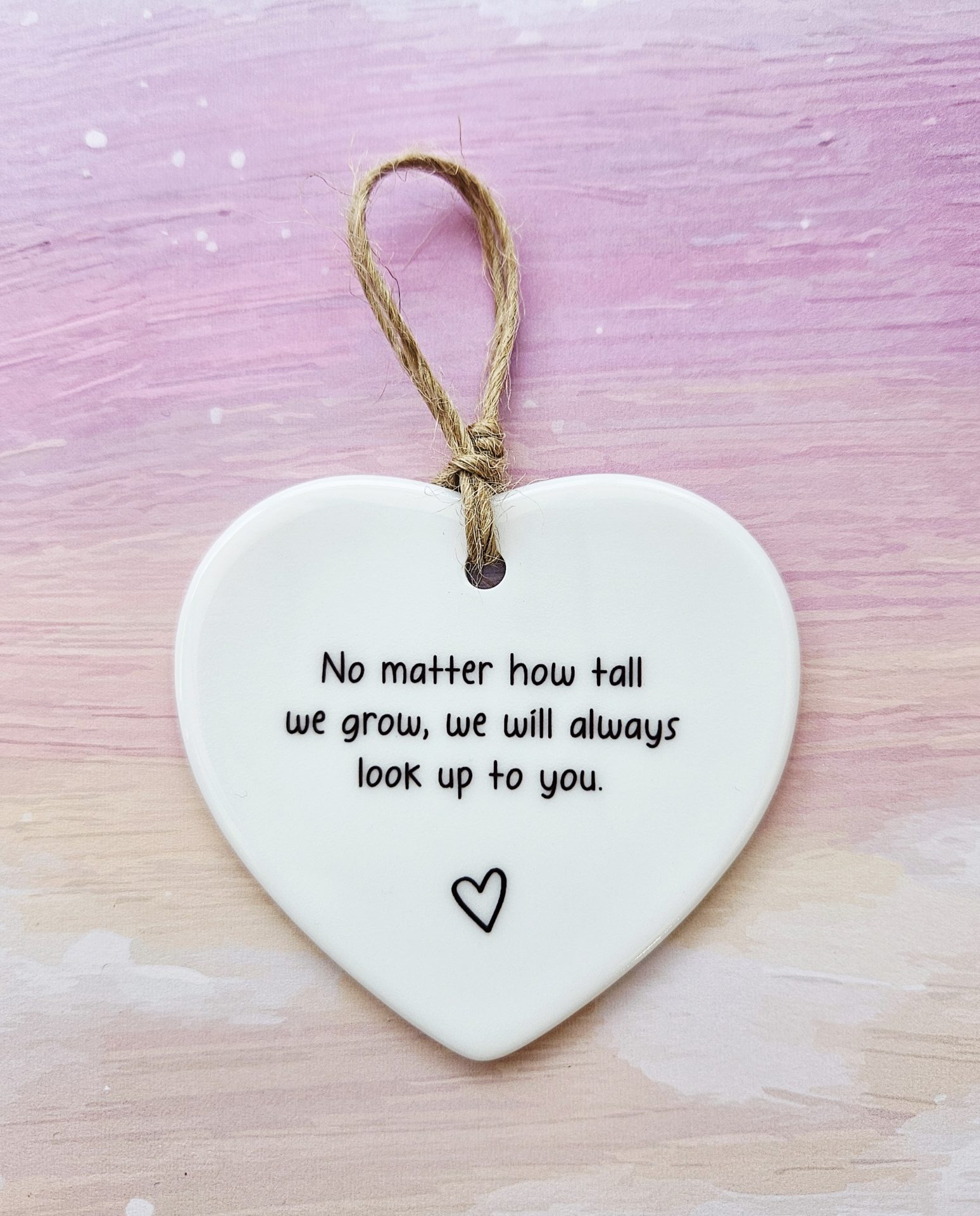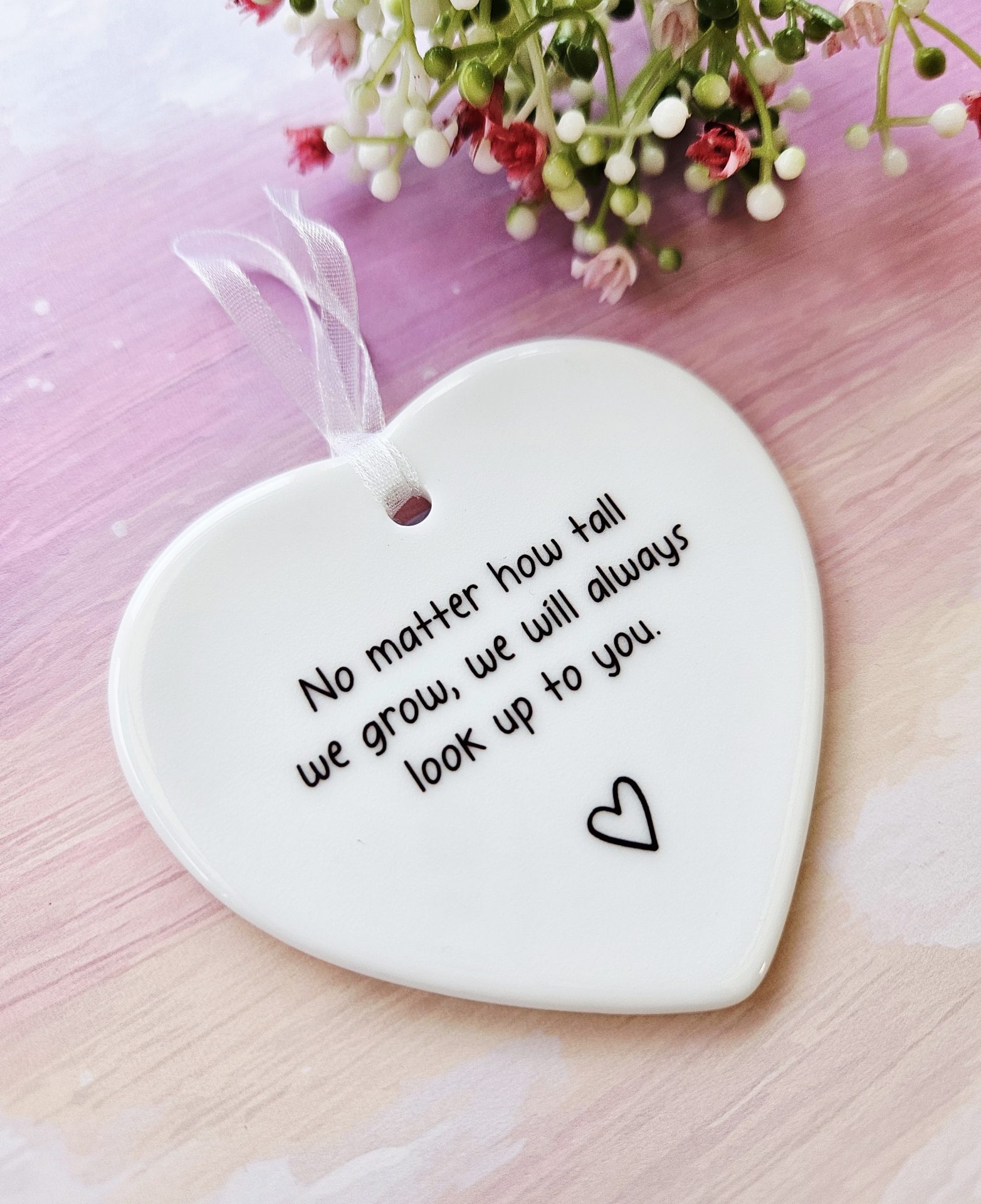 “No matter how tall I grow…” instead of “we”, simply leave a note in the box provided and I will personalise your ceramic parent heart ornament with care.
