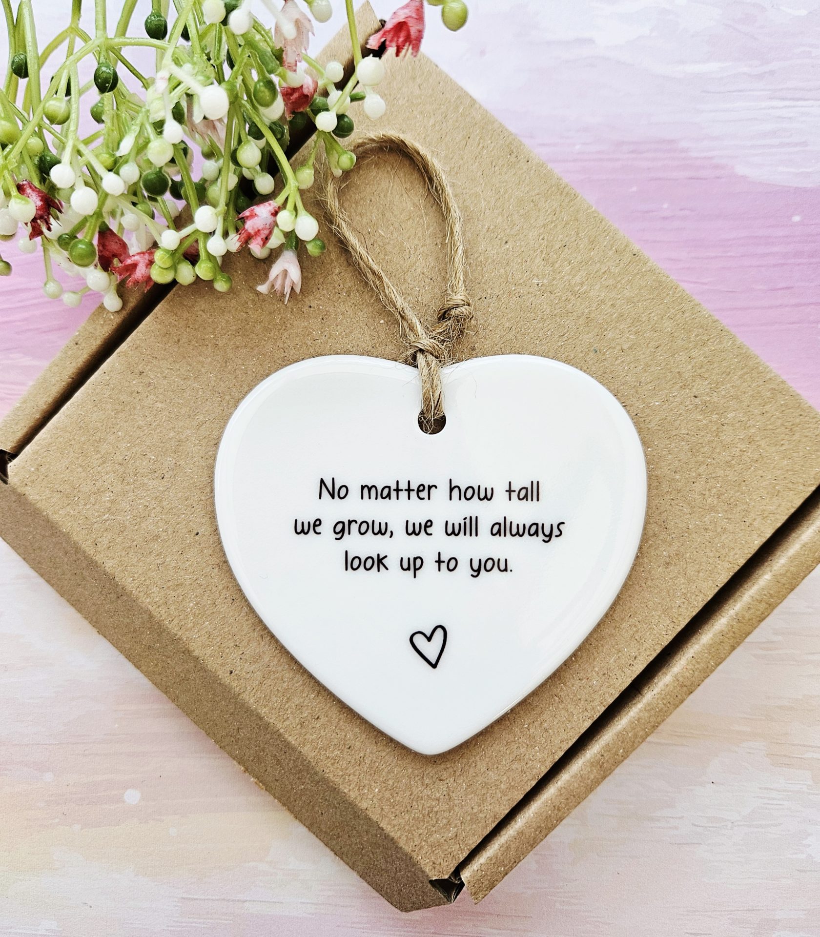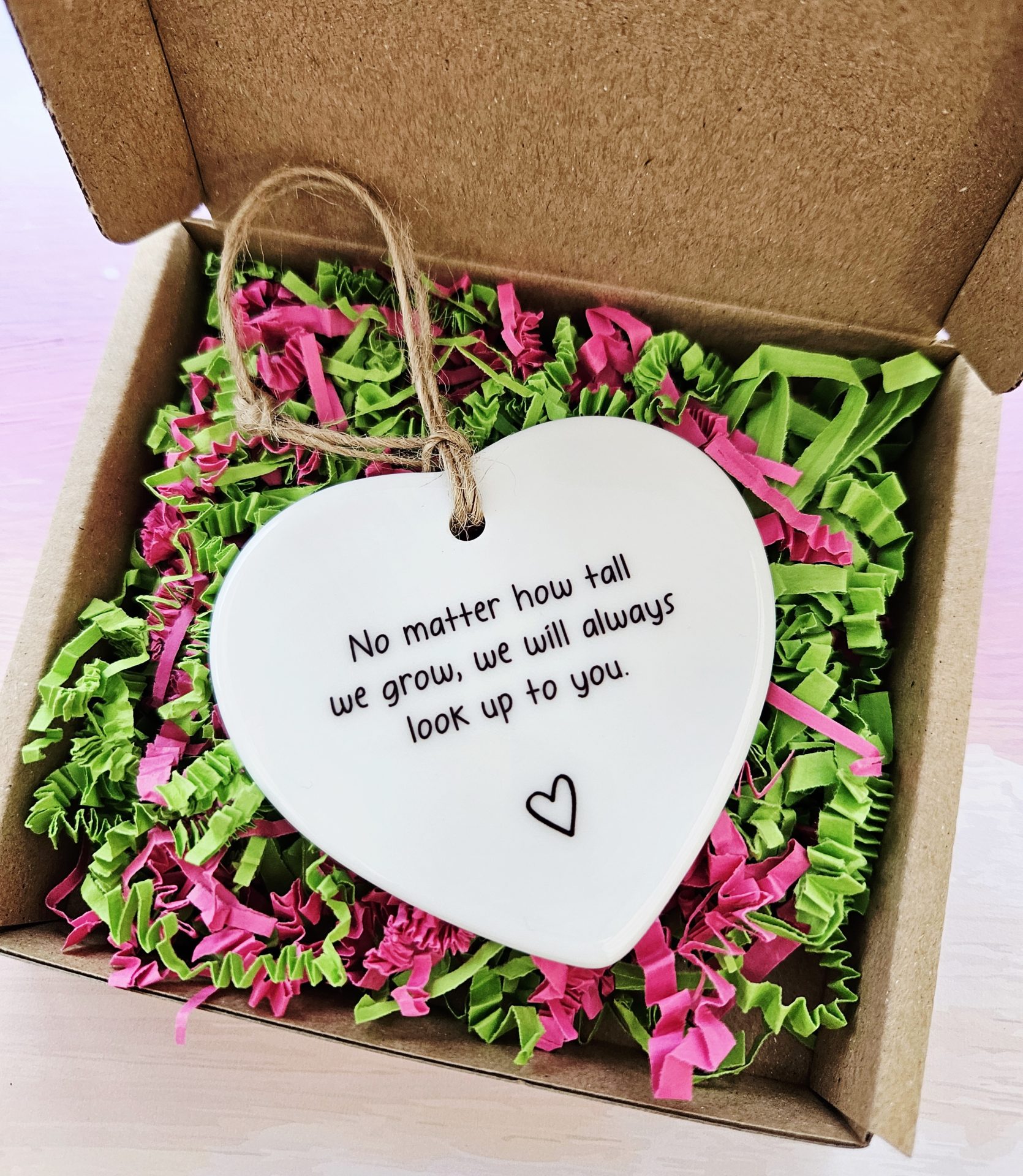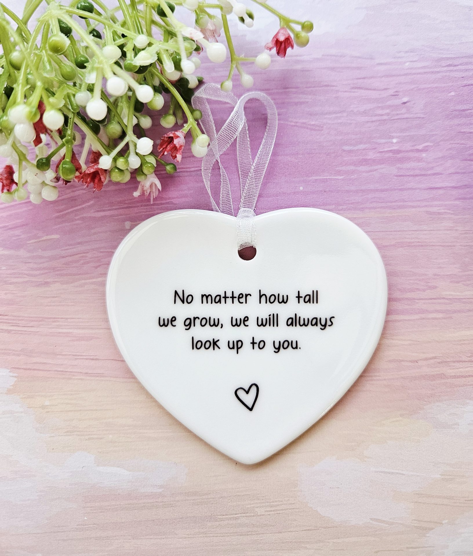 “No matter how tall I grow…” instead of “we”, simply leave a note in the box provided and I will personalise your ceramic parent heart ornament with care.
