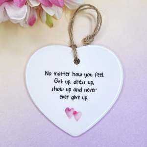 Brighten up any space with this inspiring handmade decor featuring the phrase “get up, dress up, show up and never ever give up.”