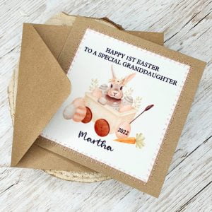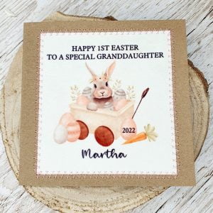 This card has a cute design of a rabbit sat in a cart surrounded by Easter eggs and is personalised with the child’s name and the year 2022, making it that extra special.