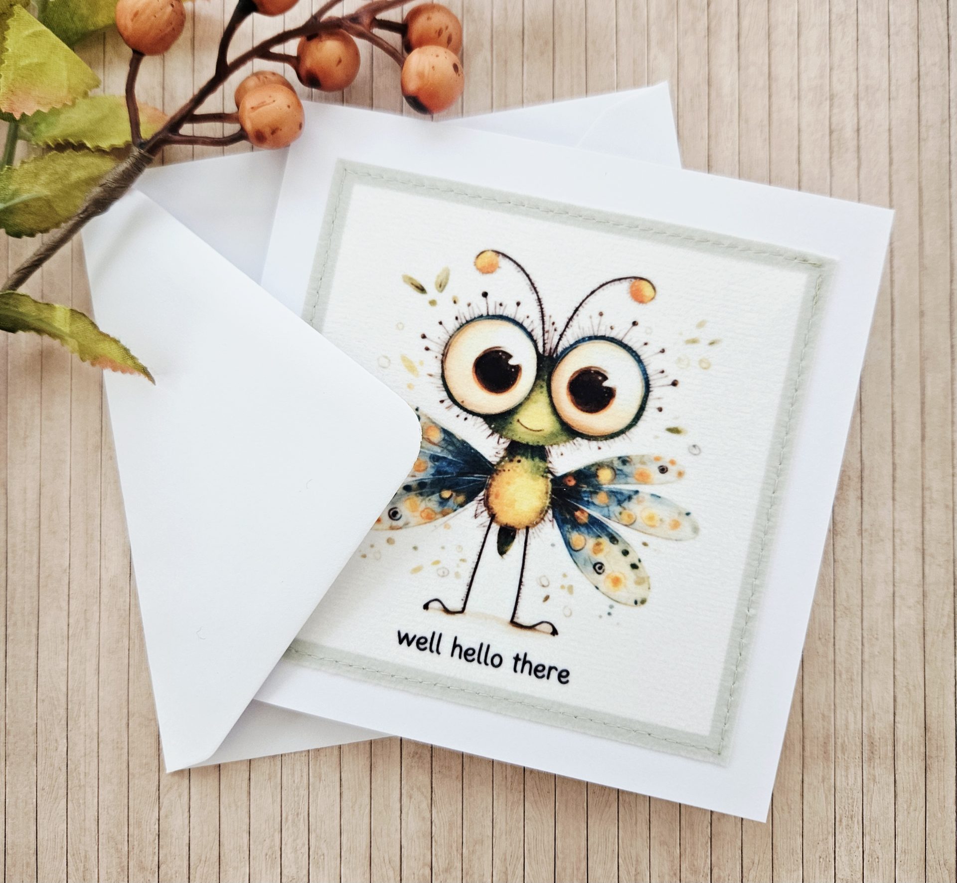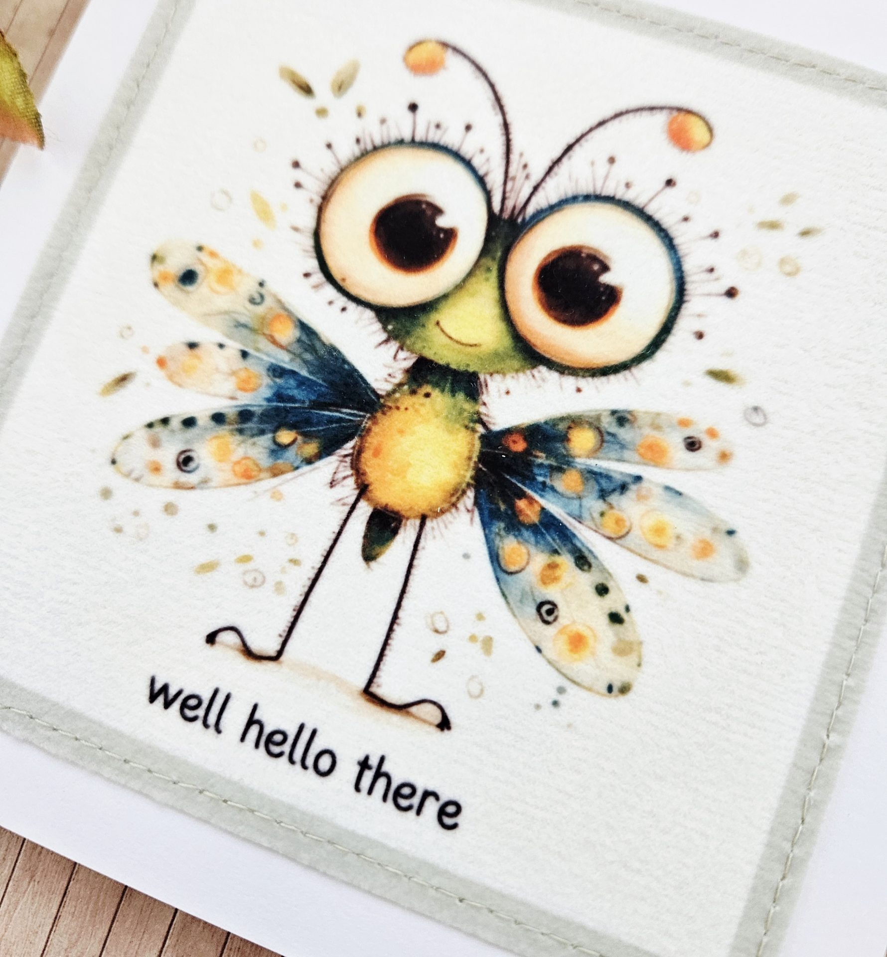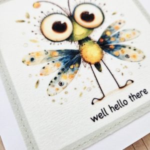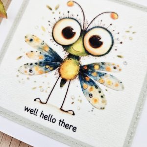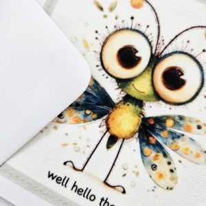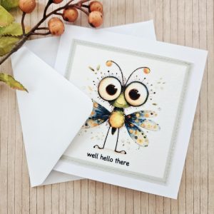 Send a cheerful, friendly message with this handmade bug fabric greeting card. The design features a sweet illustrated bug with colourful wings and big curious eyes, paired with the playful wording “well hello there”. As a result, it’s a lovely choice for friendly hellos, casual check-ins, or just because moments.