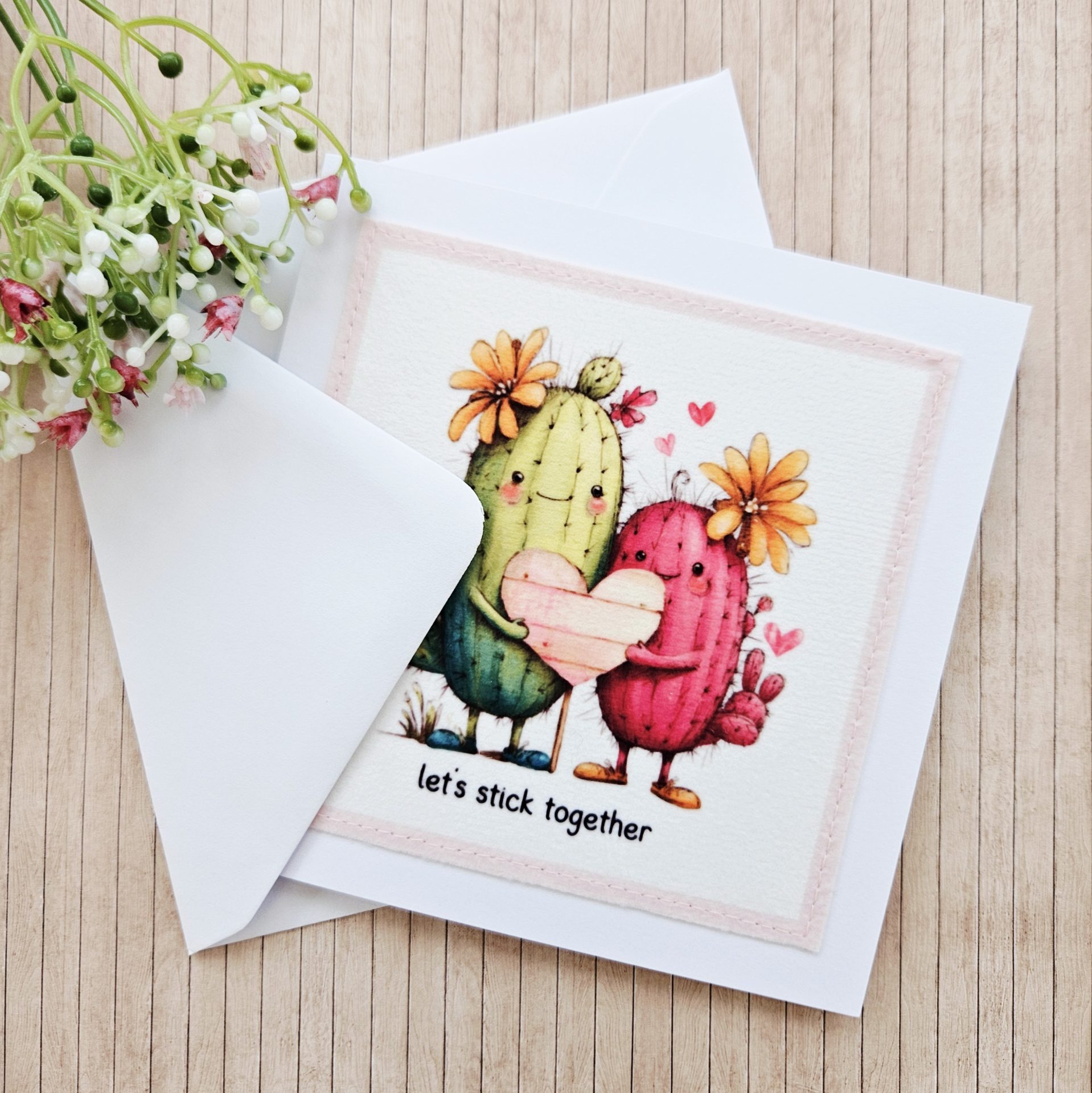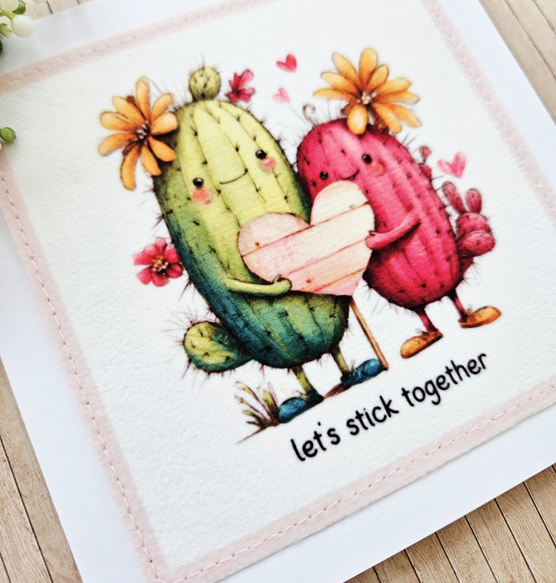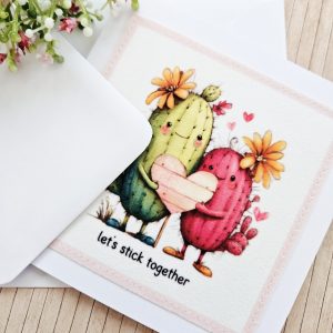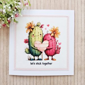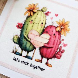 Send a gentle, cheerful message with this handmade cactus fabric greeting card. The design shows two sweet cacti standing side by side and holding a heart. The wording “let’s stick together” adds a playful and heartfelt touch.