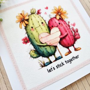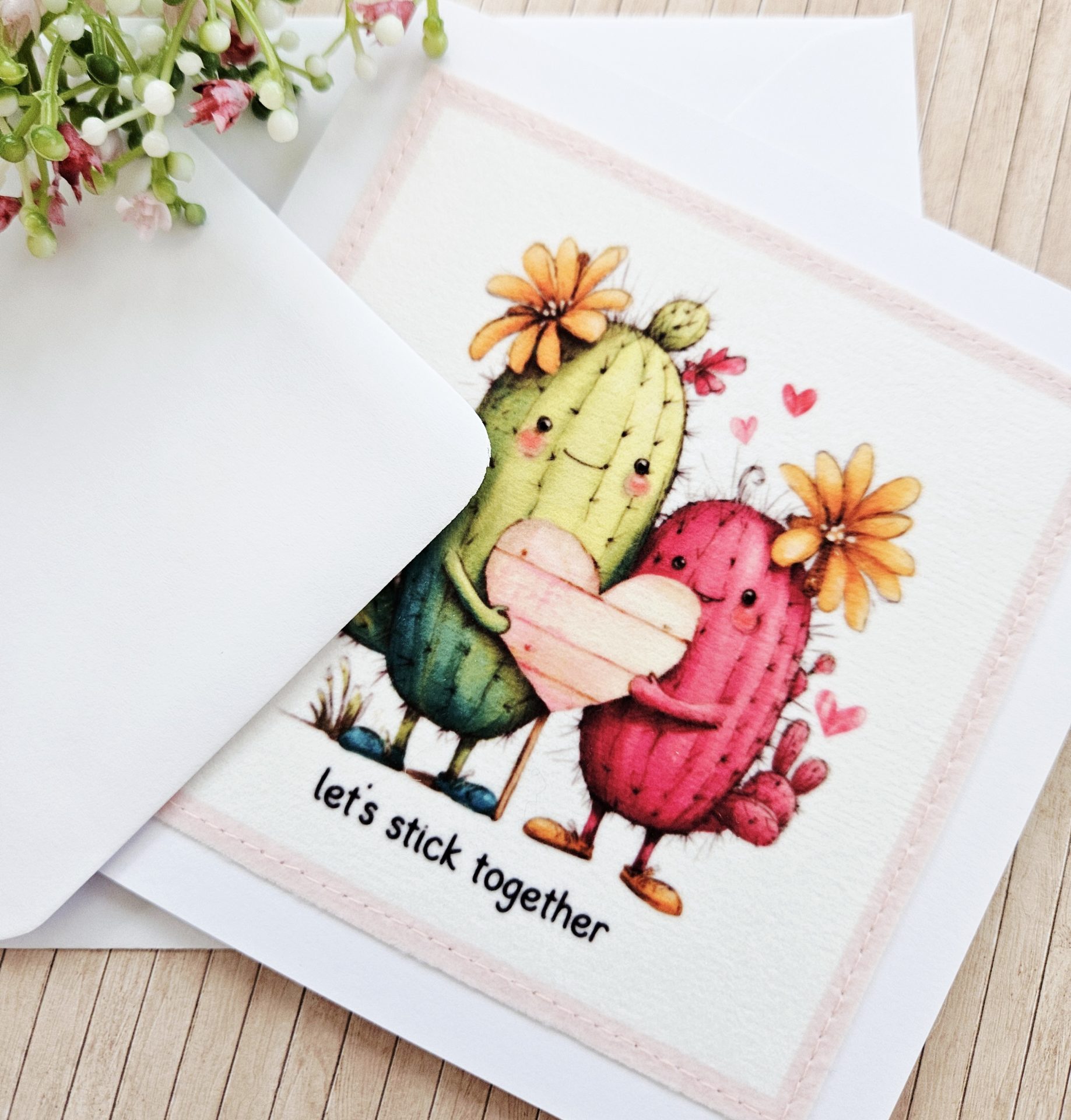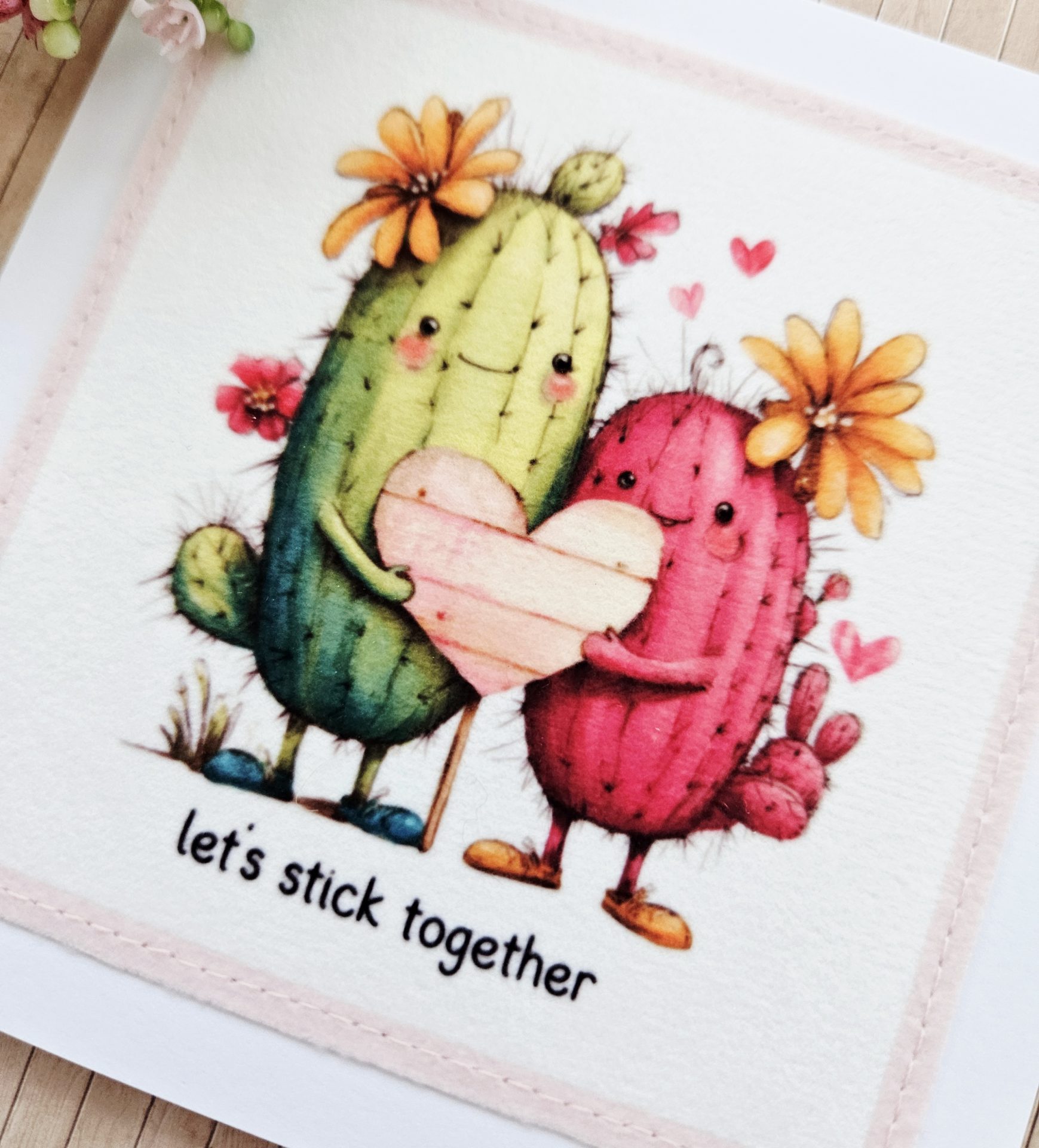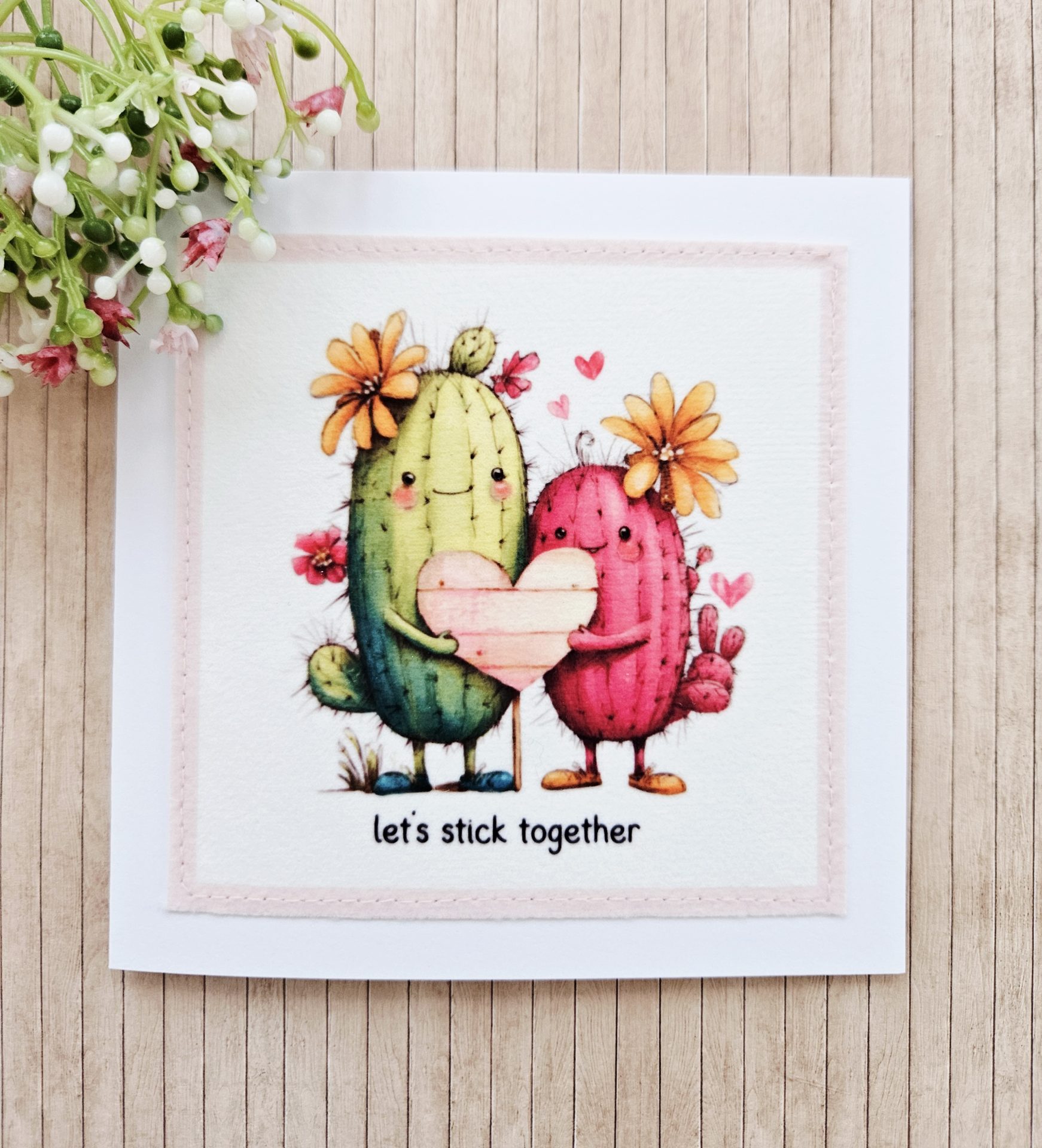 Send a gentle, cheerful message with this handmade cactus fabric greeting card. The design shows two sweet cacti standing side by side and holding a heart. The wording “let’s stick together” adds a playful and heartfelt touch.