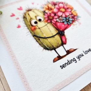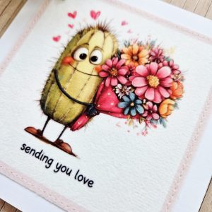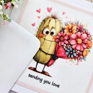 This handmade cactus love card is a warm and thoughtful way to send love. The design features a sweet illustrated cactus holding a colourful bouquet of flowers, surrounded by tiny hearts and the gentle wording “sending you love”. As a result, it’s a lovely choice for moments when you want to share care, kindness, or reassurance.