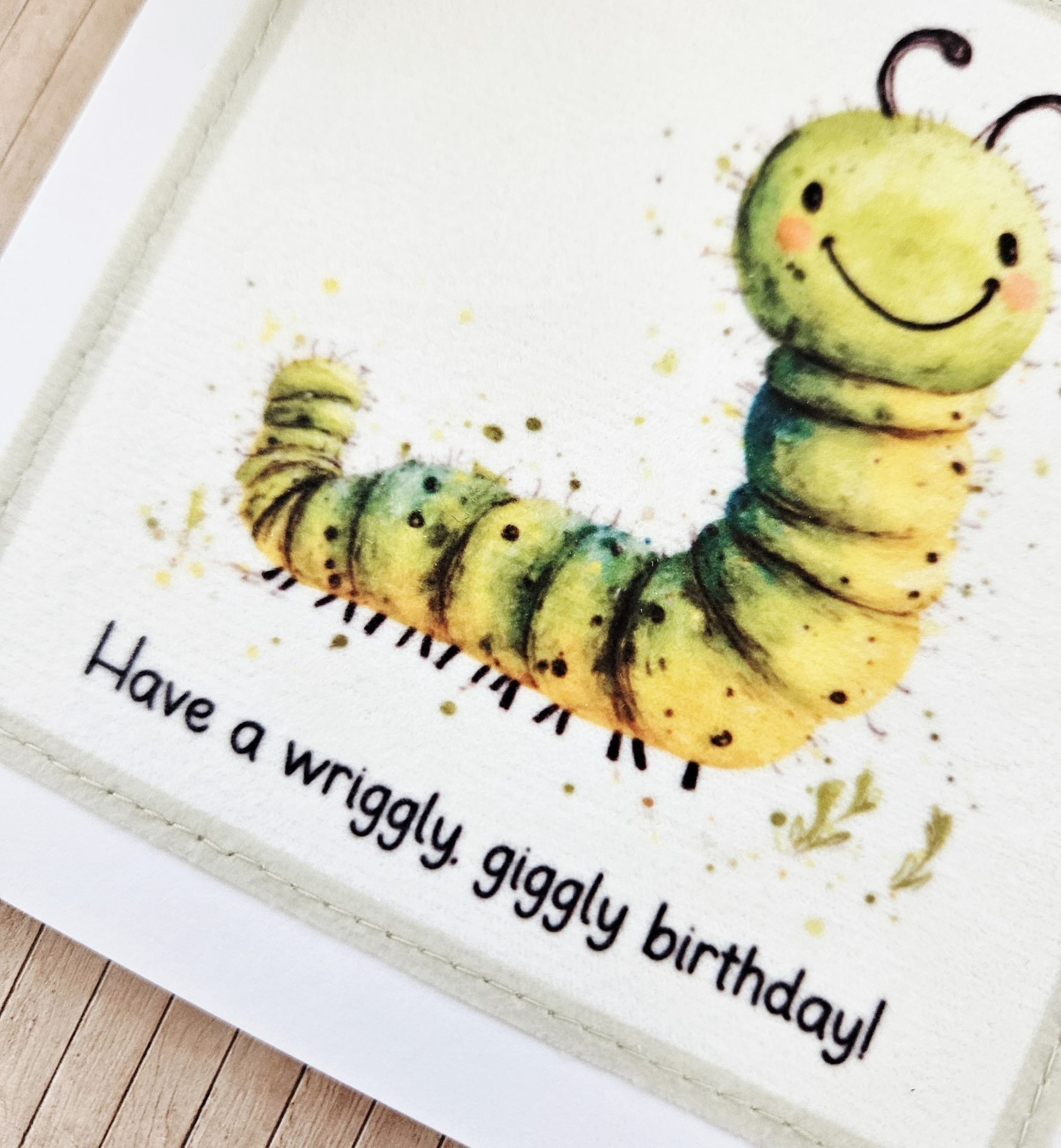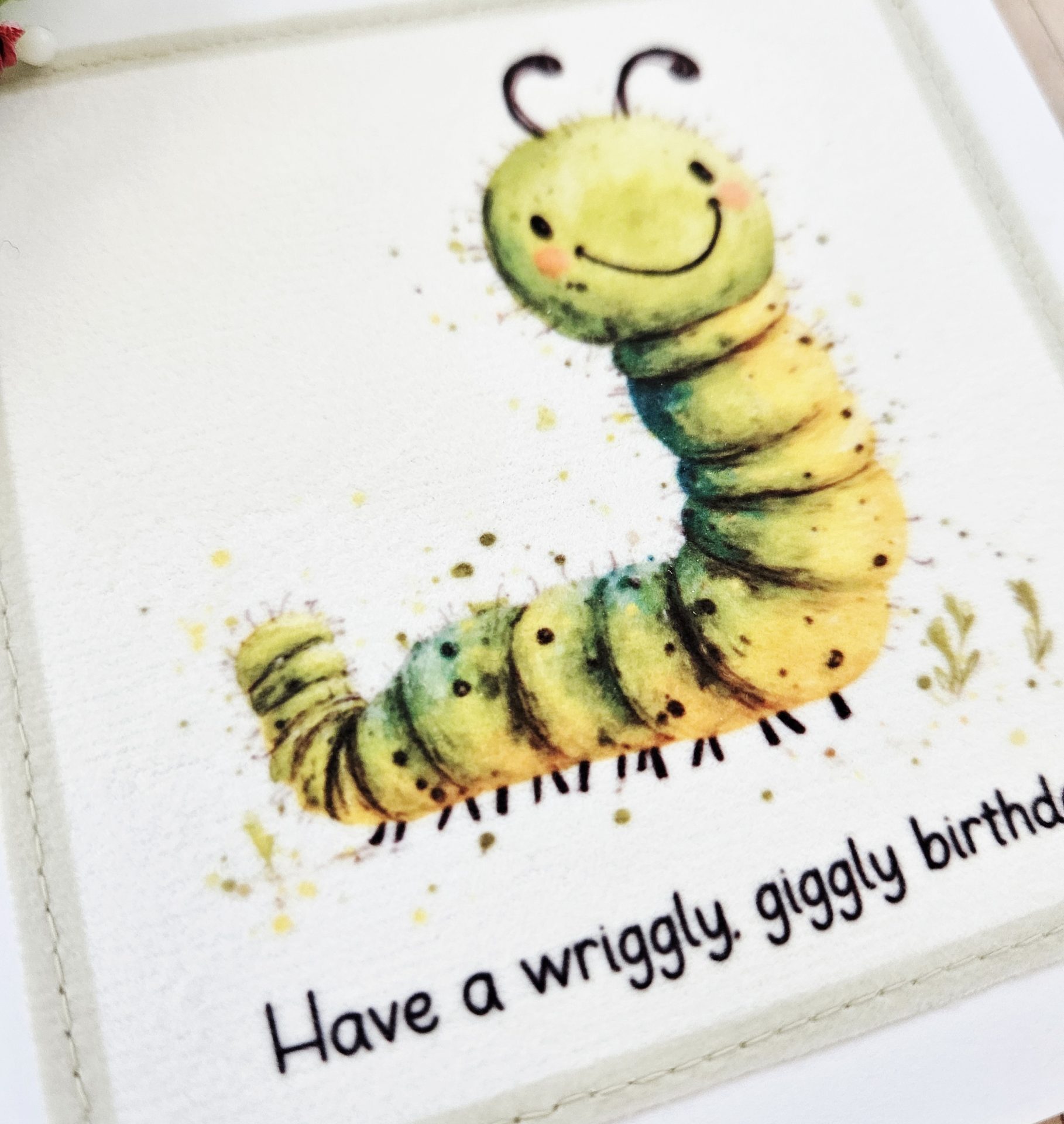 🐛 Handmade Caterpillar Fabric Birthday Card – 5 × 5 Inches