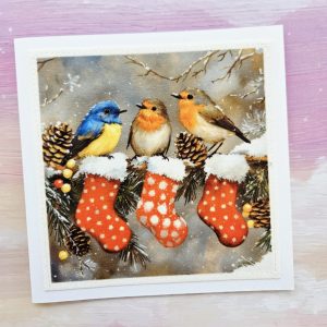 Send festive greetings with this set of 5 handmade Christmas cards featuring charming winter birds on branches, surrounded by Christmas baubles, stockings, and seasonal details. Each design is printed on fabric and carefully machine-stitched onto premium cardstock, giving a beautiful textured finish.