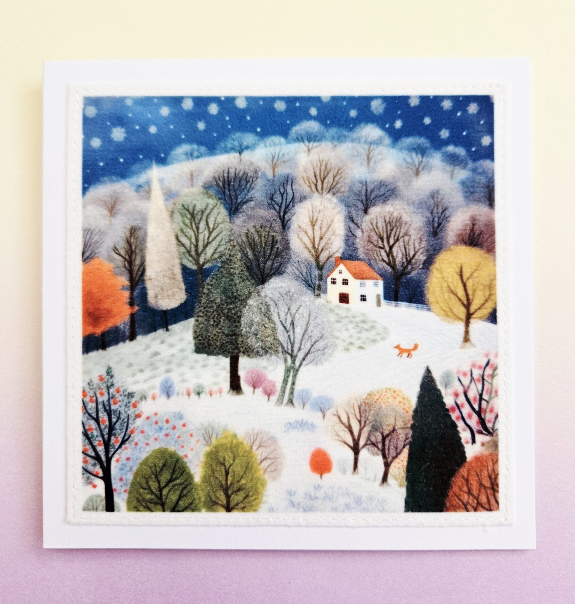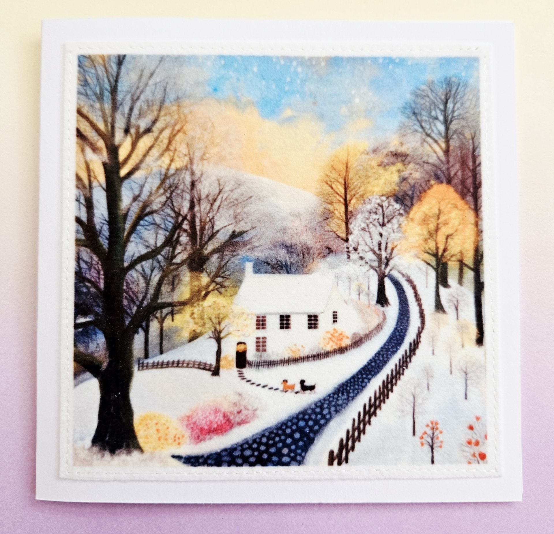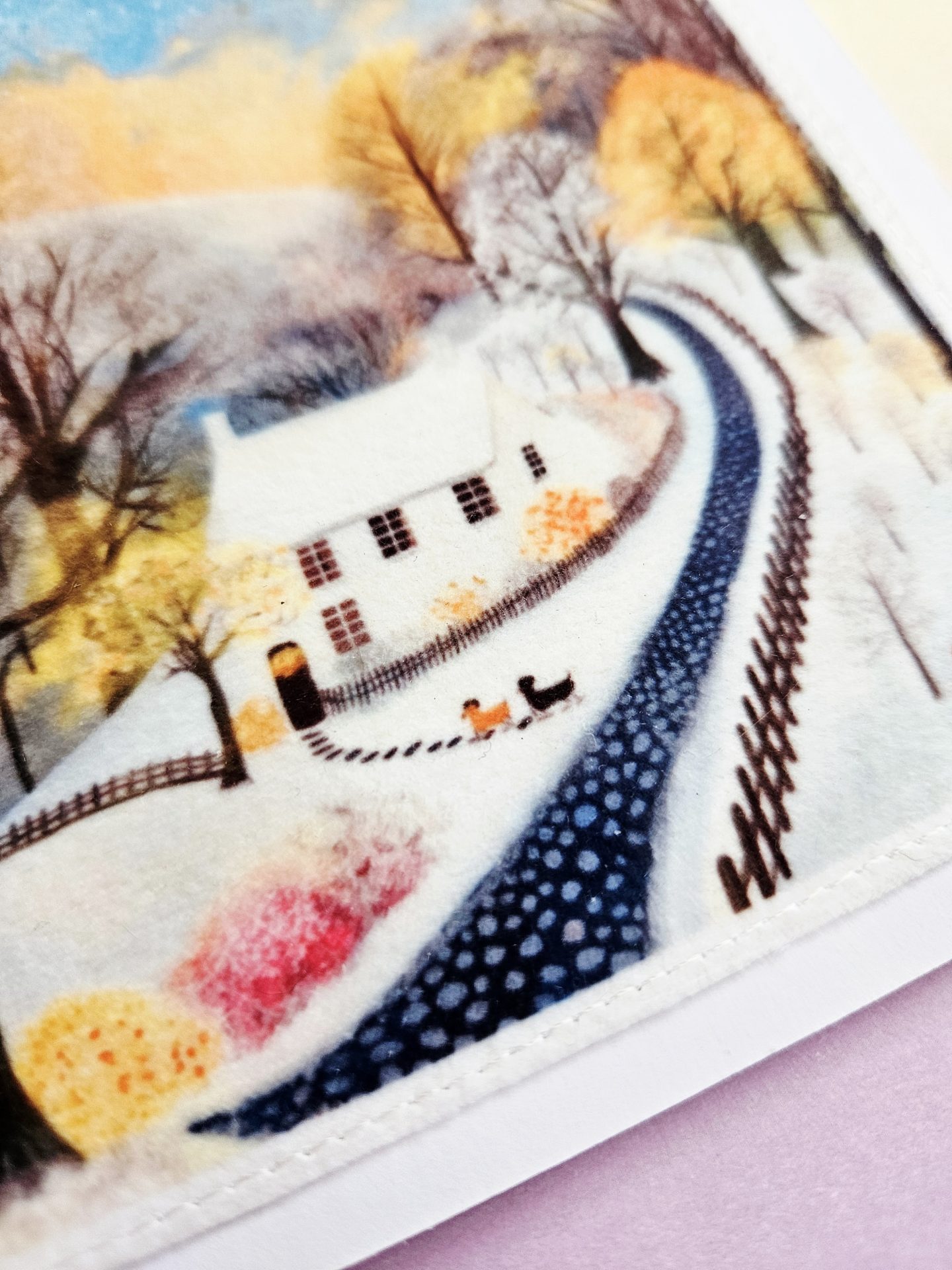 Send a touch of handmade magic this festive season with our set of 5 handmade Christmas cards. Each card features a whimsical snowy cottage scene, crafted with printed fabric and careful machine-stitching for a unique, textured finish. These rustic, cottagecore Christmas cards are perfect for lovers of cozy winter holidays and one-of-a-kind holiday greetings.
