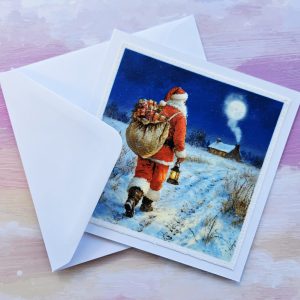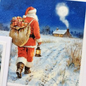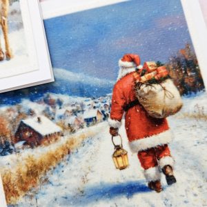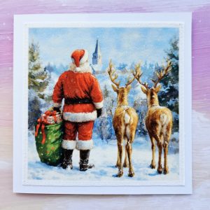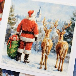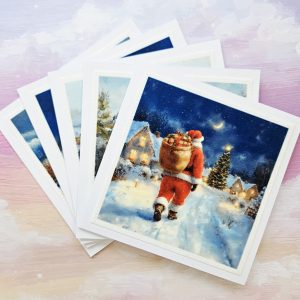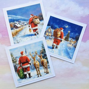 Every card showcases a snowy village scene, cosy cottages, winter trees, and Santa with his reindeer.