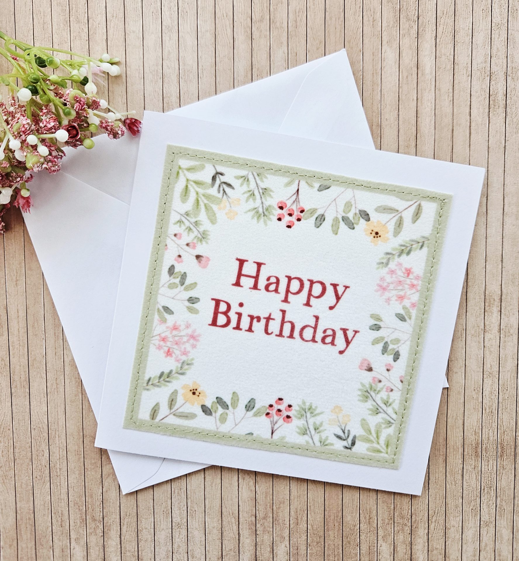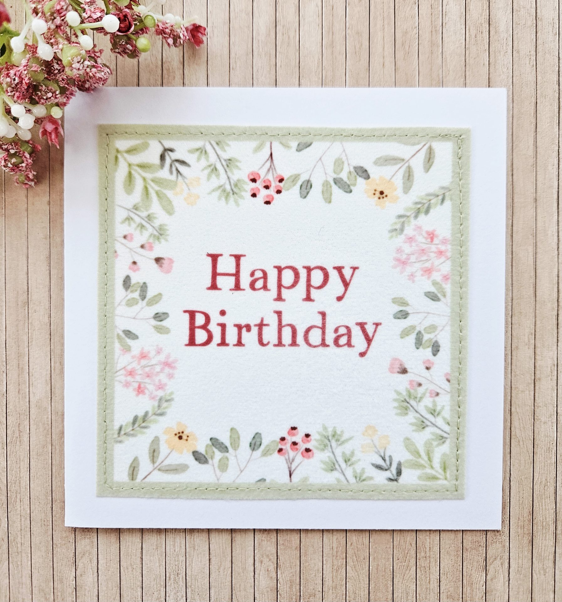 Celebrate a special day with this handmade floral fabric birthday card. It features a soft botanical wreath printed onto fabric and stitched onto a quality 5×5 square card.