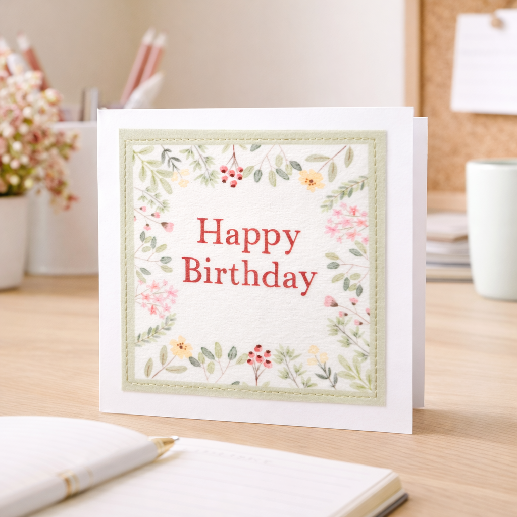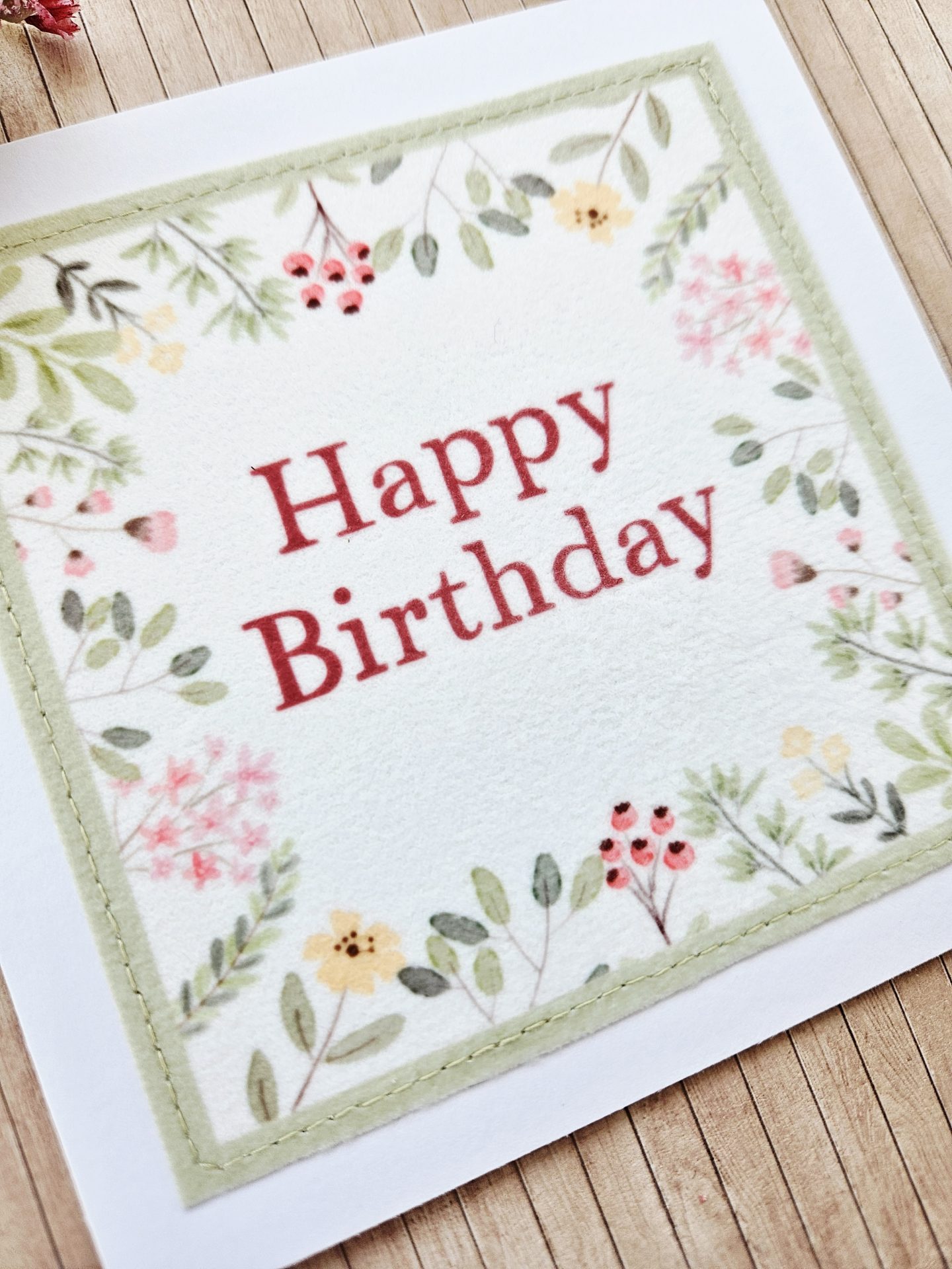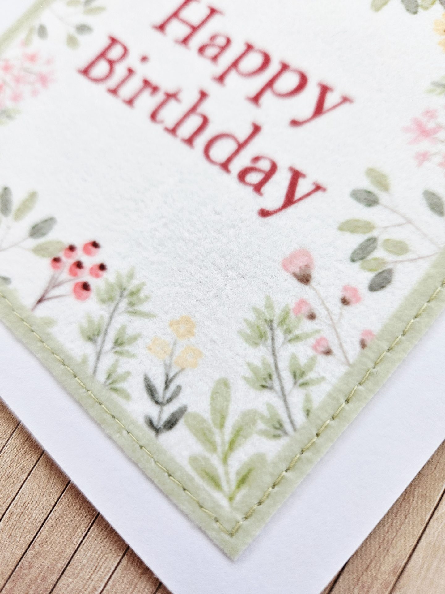 Gentle greenery and delicate florals frame the birthday message beautifully. As a result, the design feels calm, fresh and nature inspired. In addition, the stitched fabric panel adds warmth and texture. Therefore, your handwritten message feels even more meaningful.