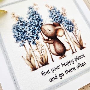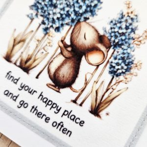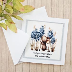 Send a gentle, reassuring message with this handmade mouse fabric greeting card. The design features a sweet illustrated mouse standing among tall blue flowers, alongside the calming words “find your happy place and go there often”. As a result, it’s a thoughtful choice for encouragement, mindfulness, or quiet thinking of you moments.