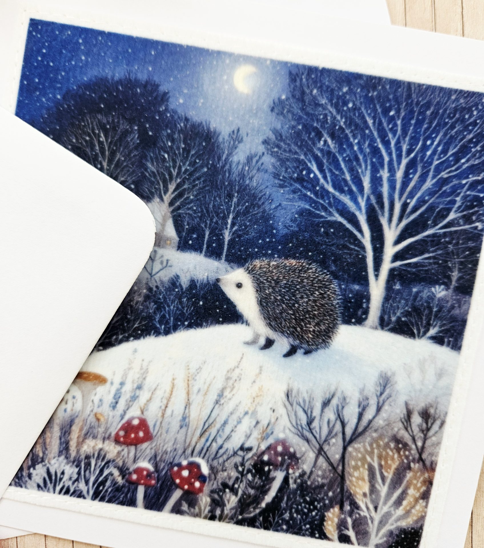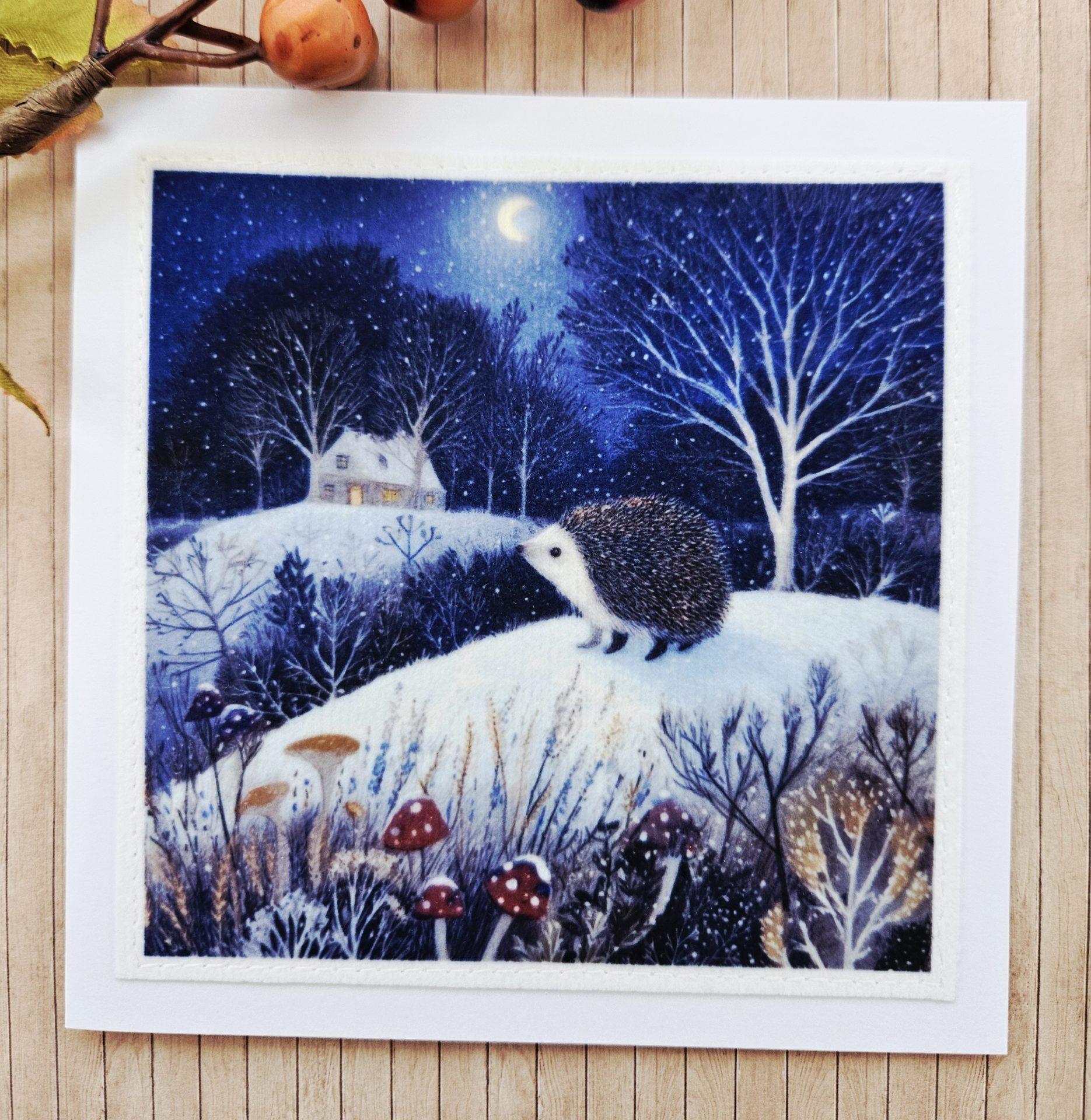 Because each card is handmade, every one feels unique. The warm winter tones and calm woodland character also make this hedgehog greeting card a timeless design that can be kept, displayed, or treasured long after it is received.