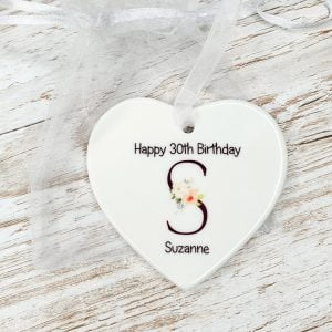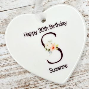 The heart is personalised with the first initial of the recipients name, then has ‘Happy 30th Birthday’ across the top along with their name at the bottom.