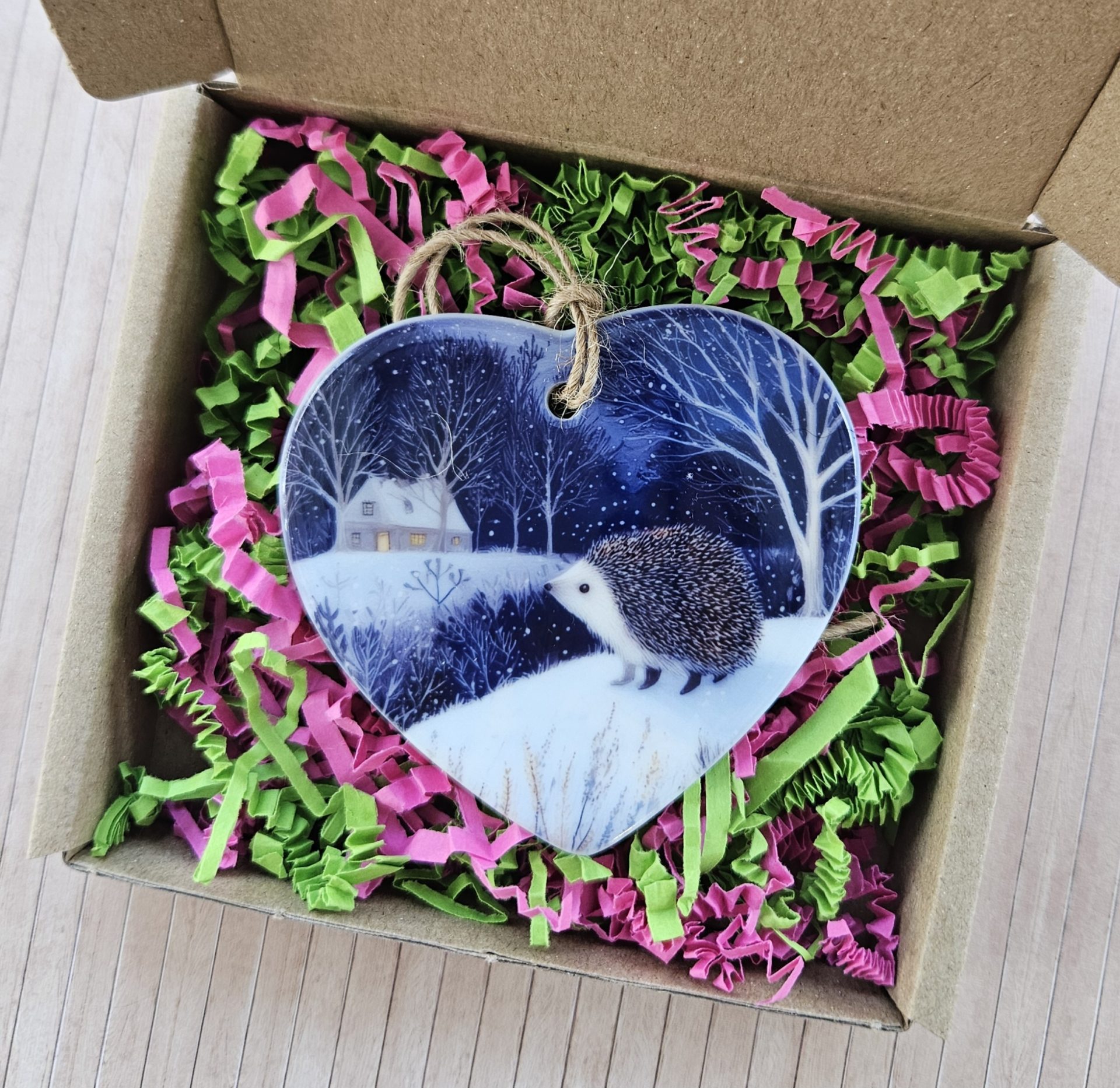 This hedgehog ceramic heart ornament brings a touch of gentle winter warmth into any home. Featuring a sweet hedgehog standing in a snowy scene with a cosy little house glowing in the distance, this handmade ceramic heart is perfect for countryside lovers, wildlife enthusiasts, and anyone who enjoys peaceful winter décor. It adds a comforting, nature-inspired charm to shelves, walls, Christmas trees, and cosy corners around the home.