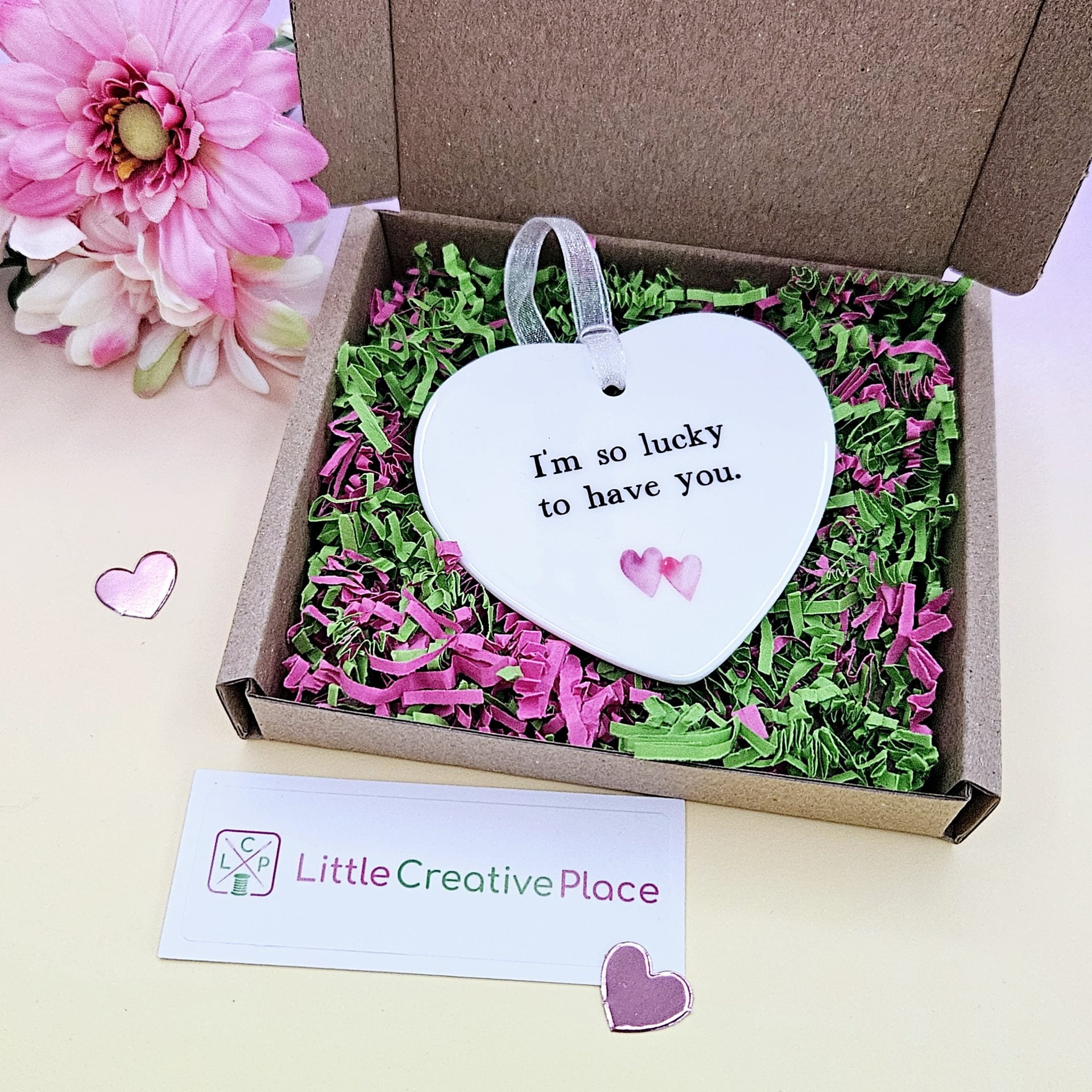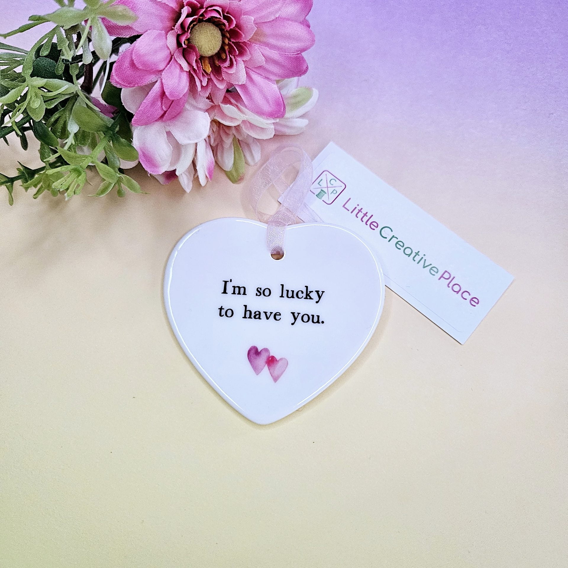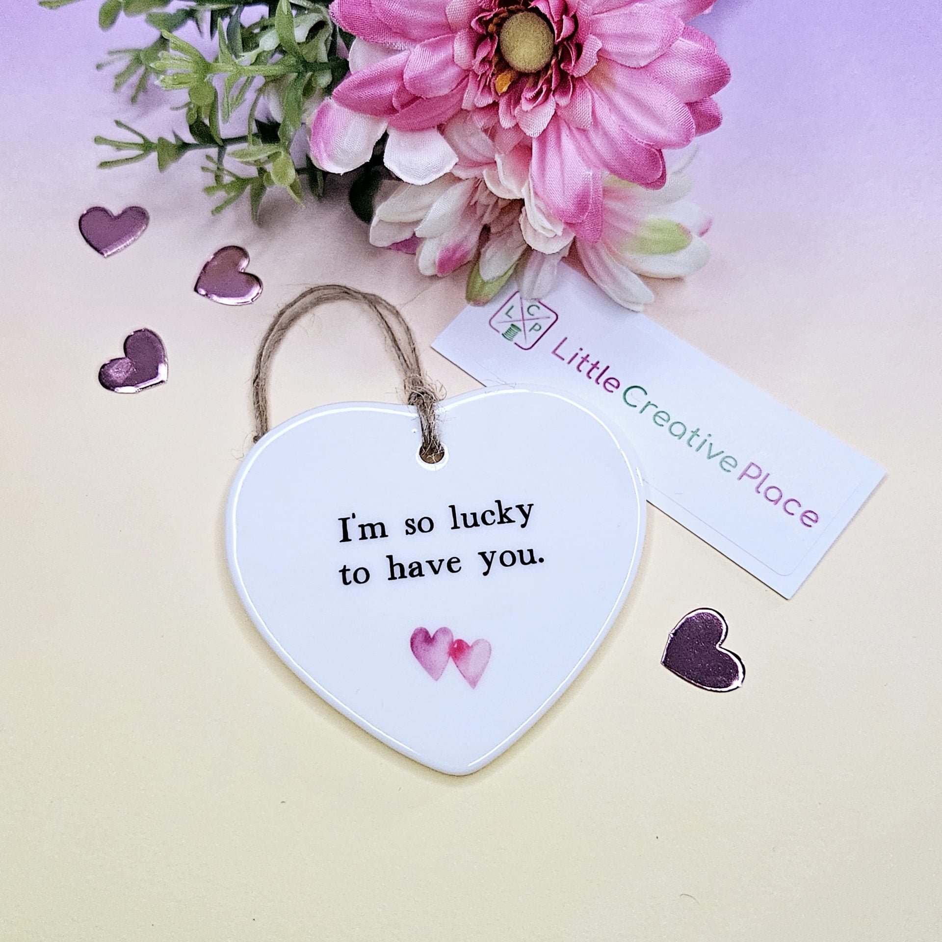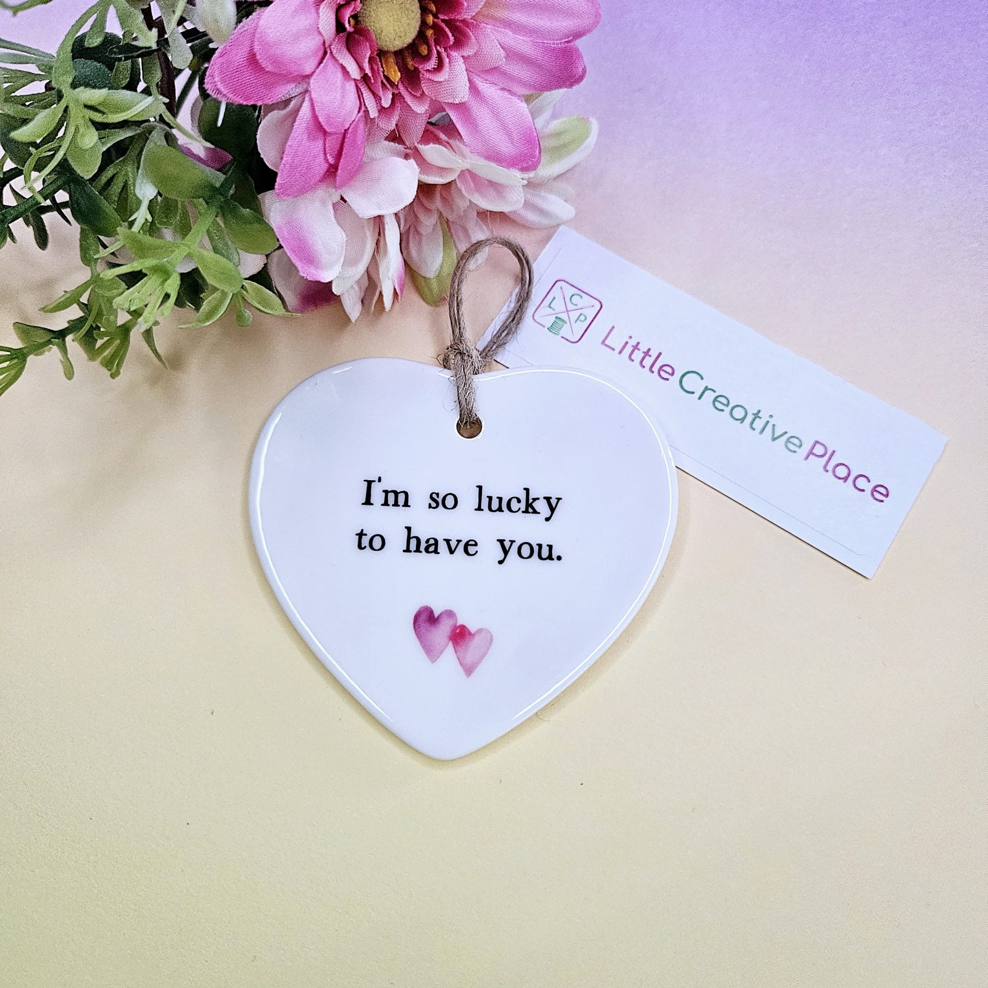 I’m so lucky to have you. A beautiful ceramic keepsake with some precious words. An ideal gift to show someone special that you feel blessed to have them in your life. Great for Valentines Day, a wedding anniversary, birthday or just to show someone close how much you appreciate them.