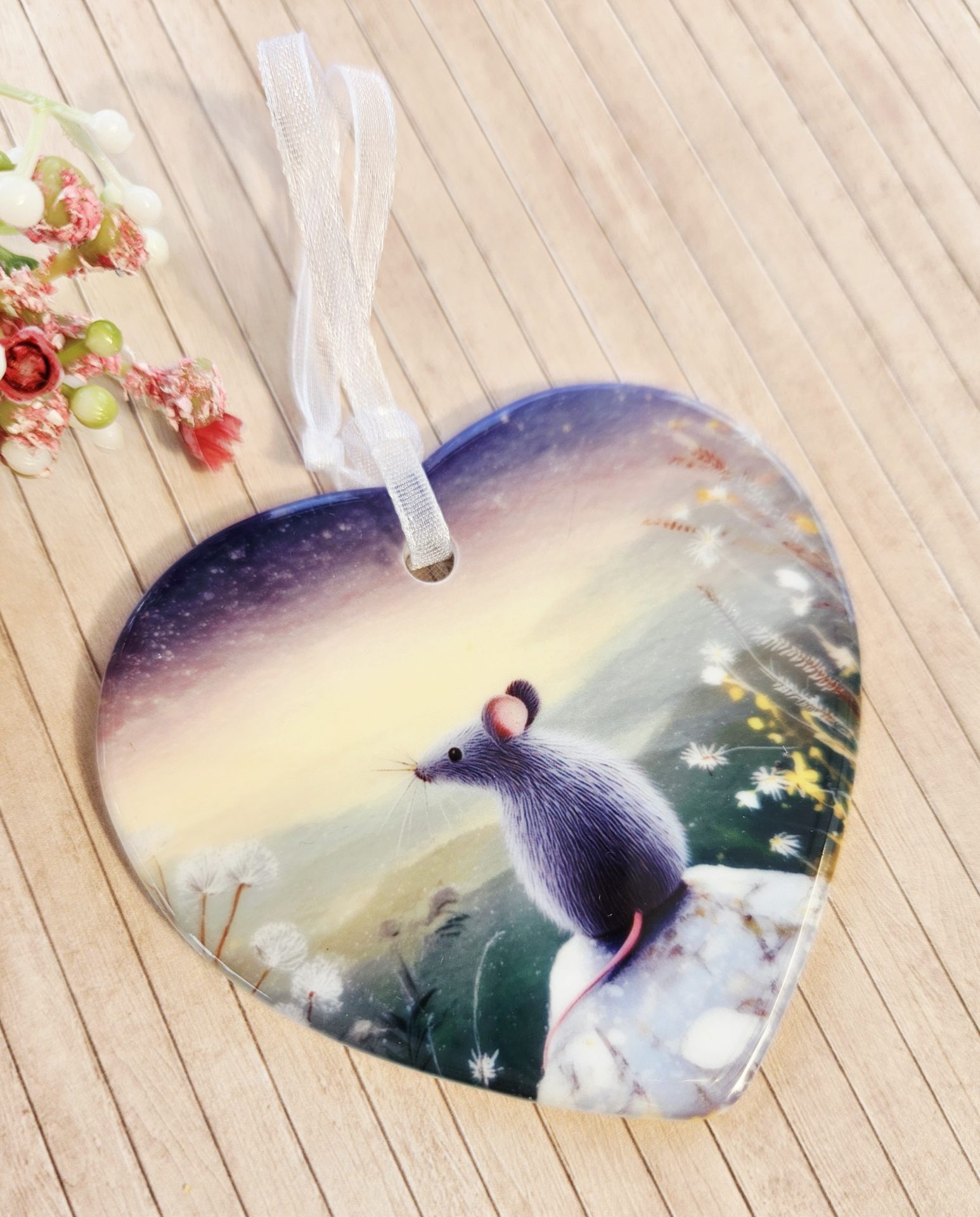 Send a quiet moment of calm with this mouse gift ceramic heart, featuring a sweet little mouse nestled in a peaceful countryside scene.