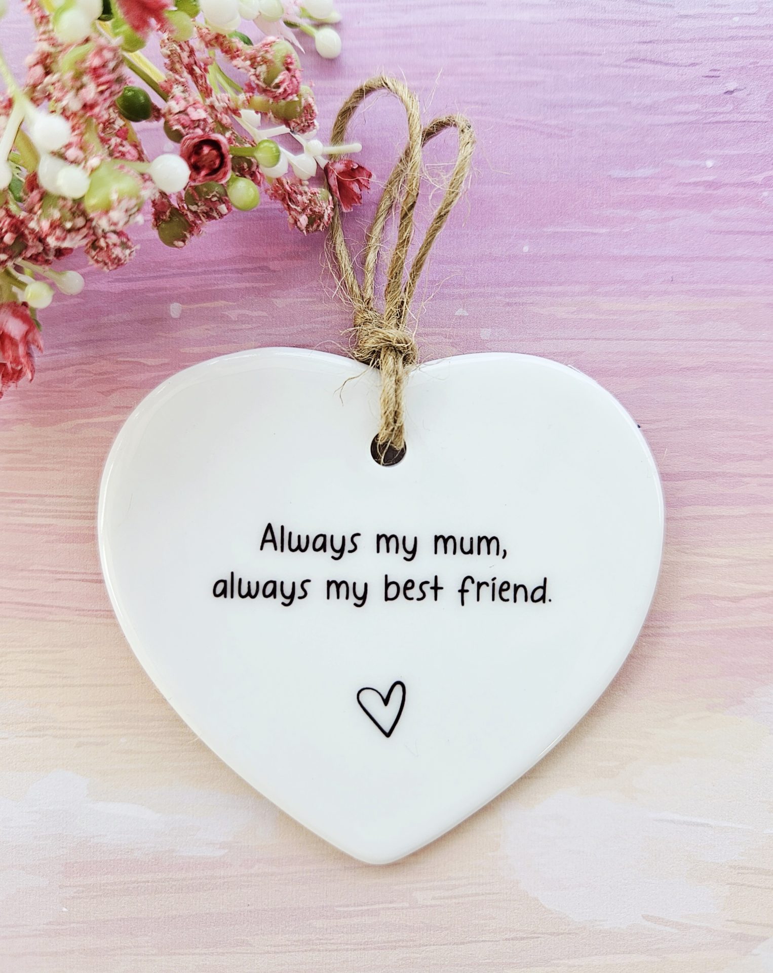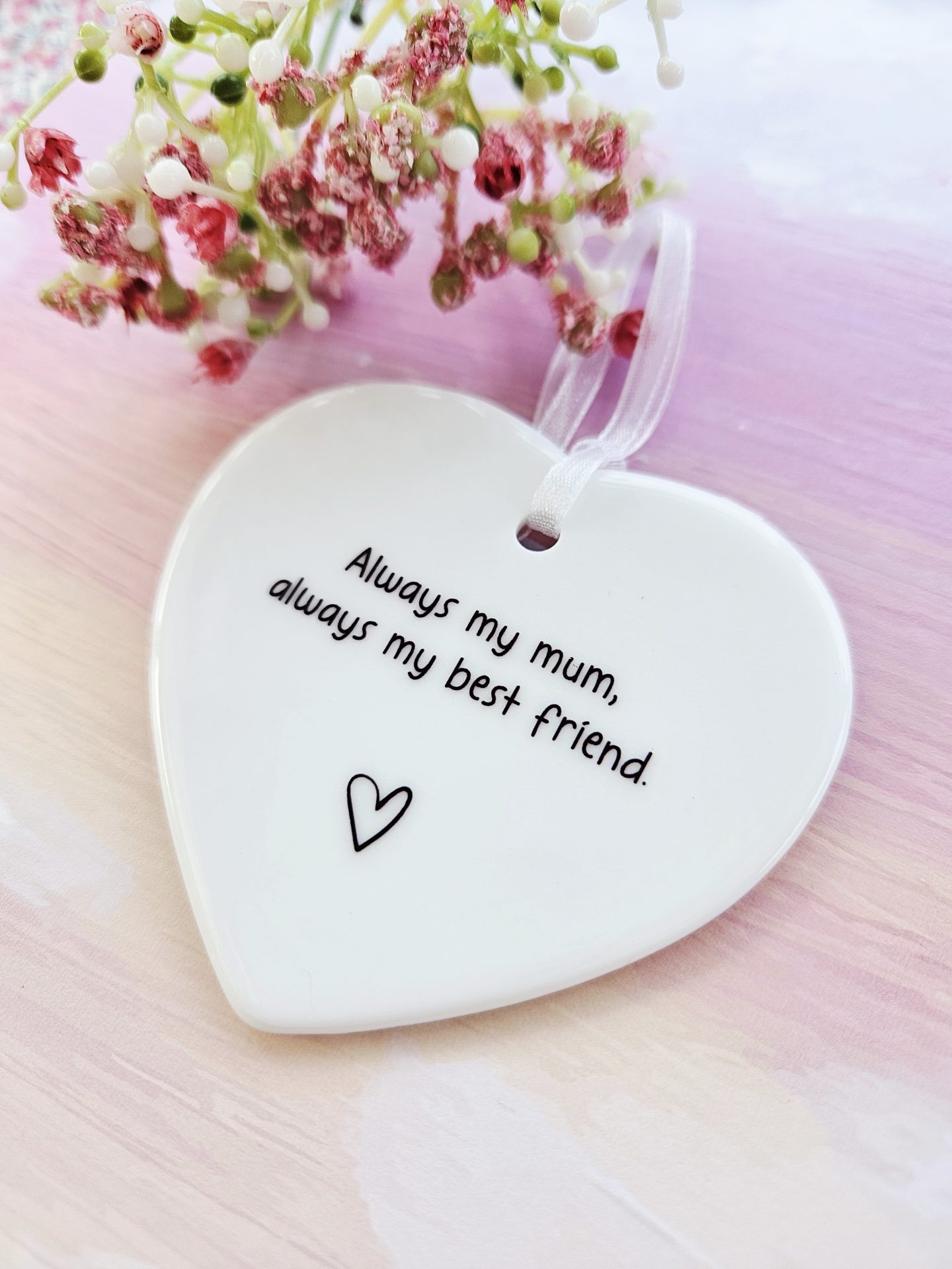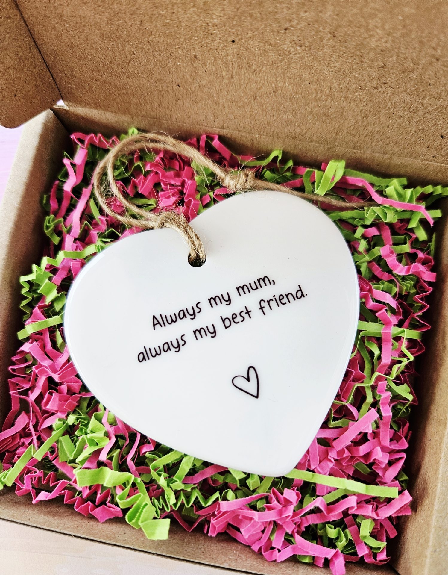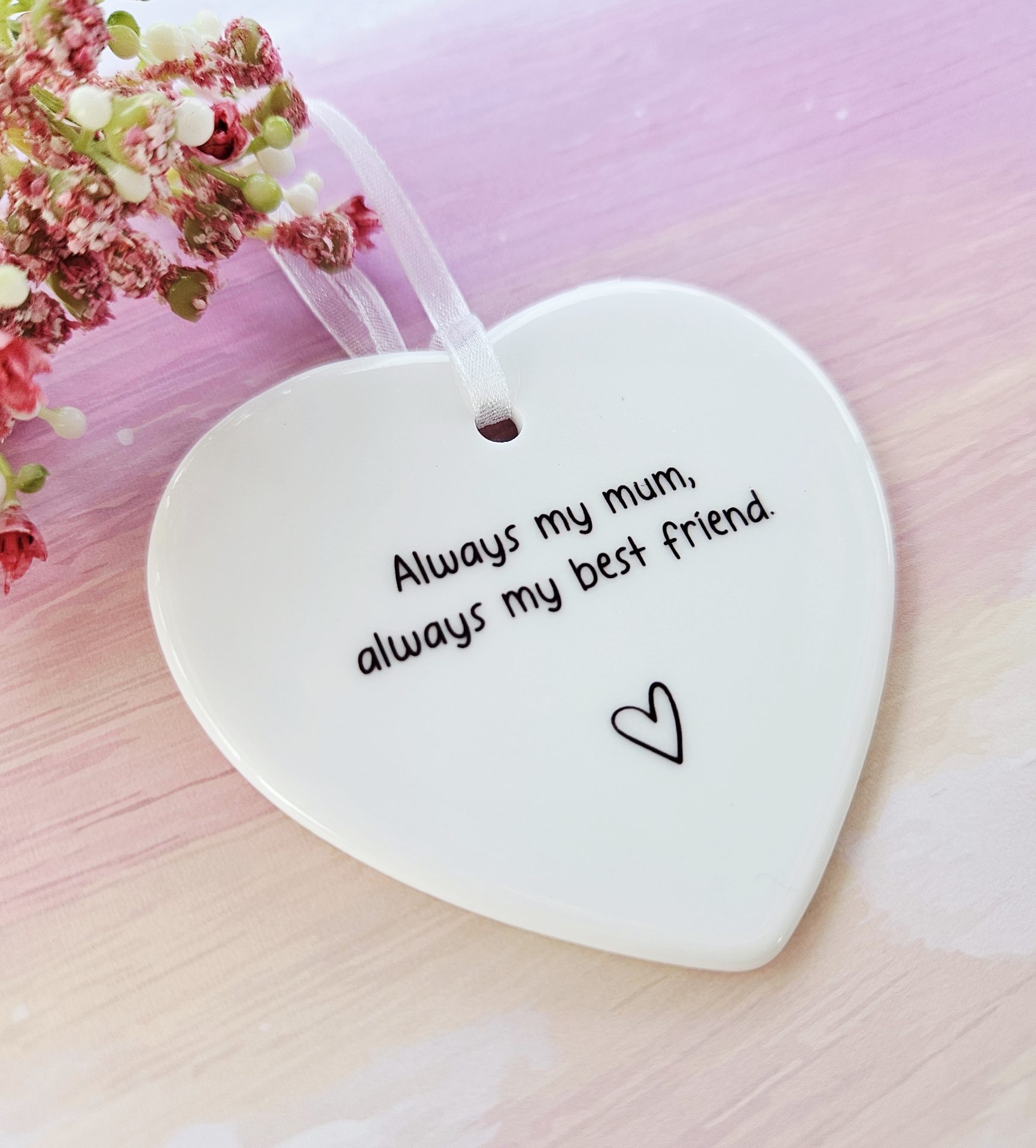 This mum heart ornament features the heartfelt message, “Always my mum, always my best friend.” It is simple, meaningful and full of love.