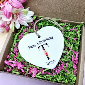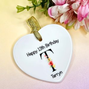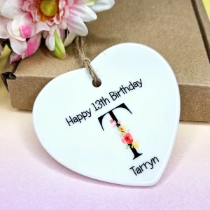 - Personalised 13th birthday heart keepsake with initial, name, and “Happy 13th Birthday” message