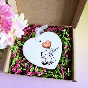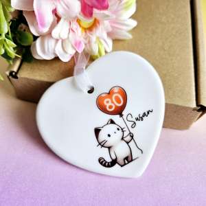 Celebrate a special 80th birthday milestone with a meaningful, personalised gift for her. This heart-shaped ceramic keepsake features an adorable cat holding a balloon, perfect for cat lovers and those seeking a unique 80th birthday present. Thoughtfully packaged for gifting, this charming keepsake captures the joy of a milestone birthday.