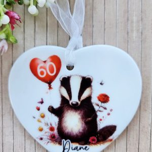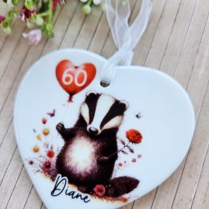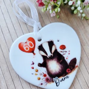 🎈 Personalised Badger Birthday Ceramic Heart Keepsake