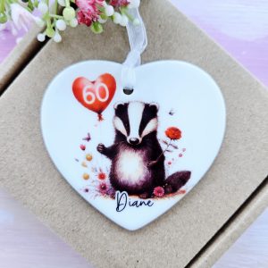 Celebrate a special birthday with this personalised ceramic heart keepsake. It features an adorable badger holding a heart-shaped balloon, surrounded by delicate floral details. As a result, it has a soft and charming woodland feel.