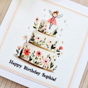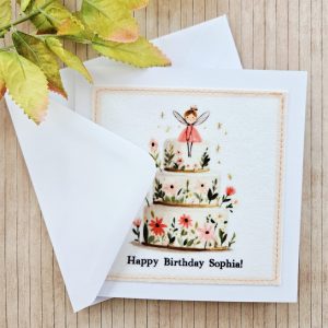 This personalised fairy birthday card is a magical way to celebrate a child’s special day. The design features a sweet fairy sitting atop a floral birthday cake, surrounded by soft pastel flowers and tiny golden star details. As a result, it has a gentle, storybook feel that’s perfect for a joyful birthday celebration.