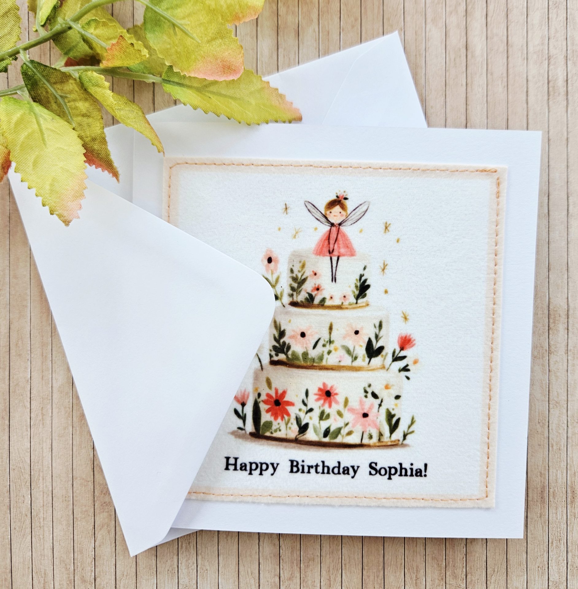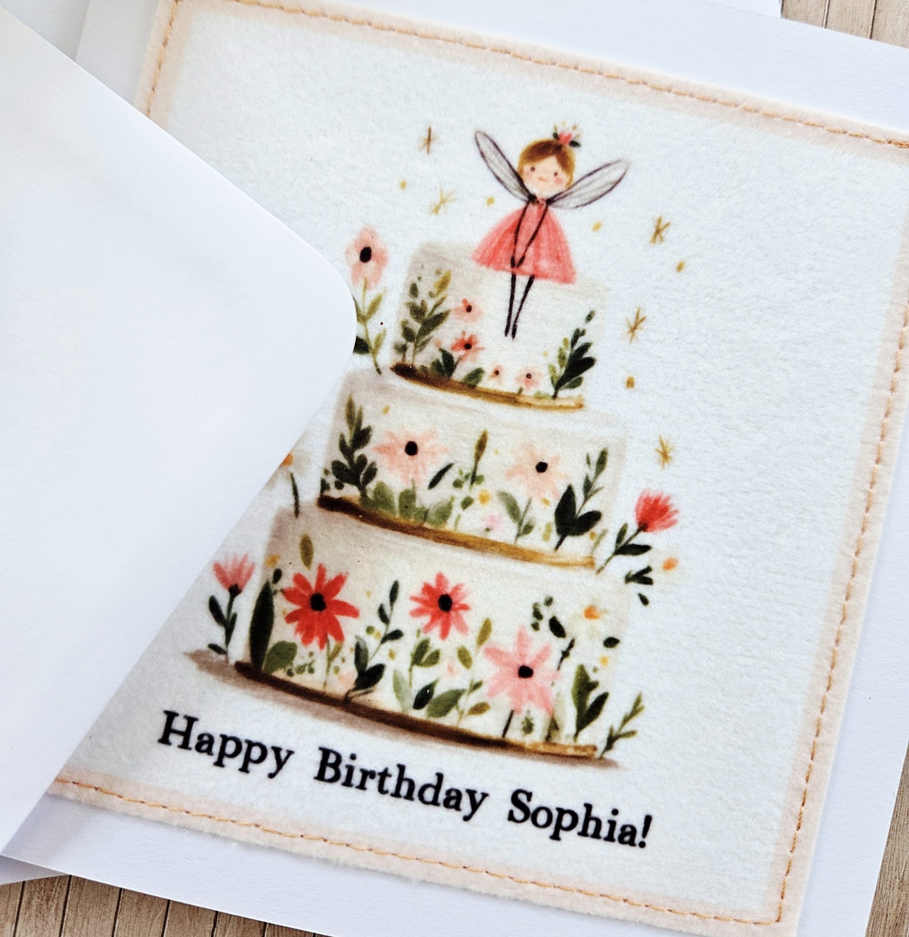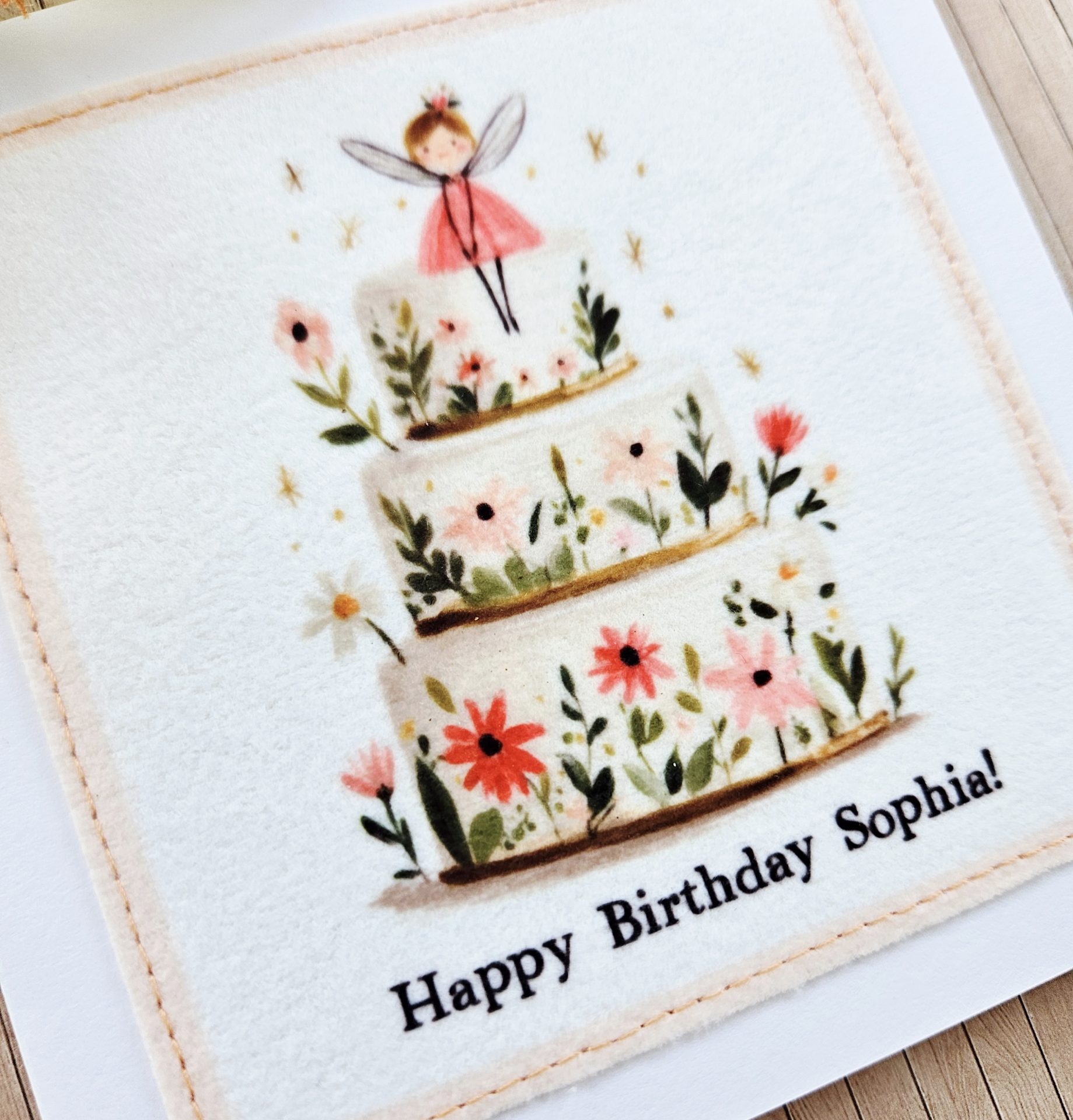 I print the fairy illustration onto fabric and then carefully stitch it onto high-quality 250gsm card. This creates a lovely textured finish with a premium, handmade feel. In addition, the stitched edge adds gentle detail and makes the card feel thoughtfully made.