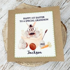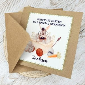 This card has a cute design of a rabbit sat in a cart surrounded by Easter eggs and is personalised with the child’s name and the year 2022, making it that extra special.