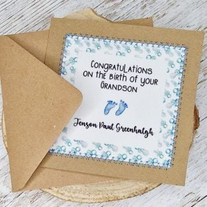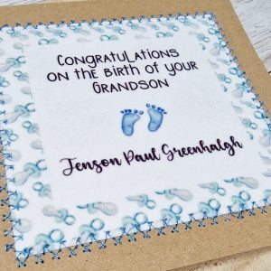 A personalised new baby grandson card for grandparents. A lovely way to congratulate the grandparents with this cute handmade blank card.
