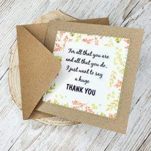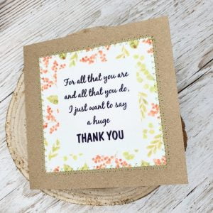 This card is homemade by myself and has a lovely thank you quote on the front which is printed onto a lovely 100% polyester, white ‘suede feel’ fabric, giving it a lovely soft feel.