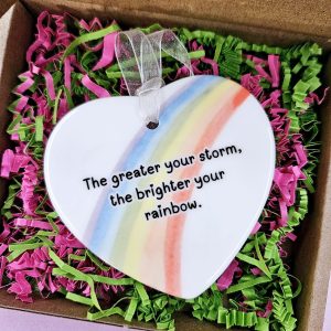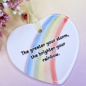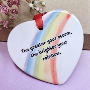 “The Greater Your Storm, The Brighter Your Rainbow”, a cute motivational rainbow ceramic that serves as a perfect reminder of resilience and perseverance.