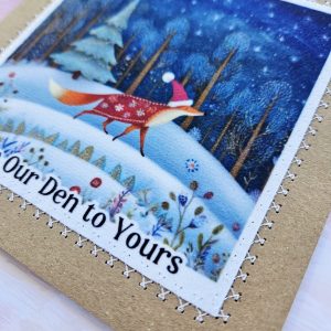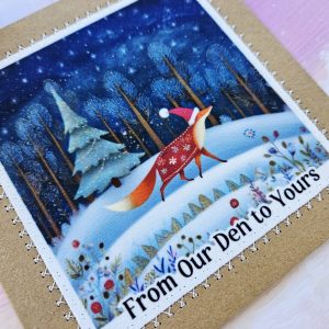 Handmade woodland fox Christmas card with “From Our Den to Yours” greeting