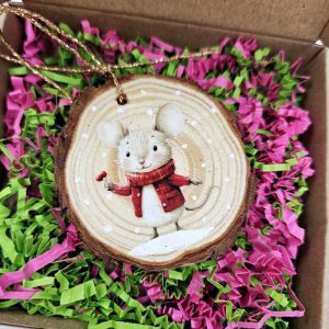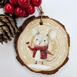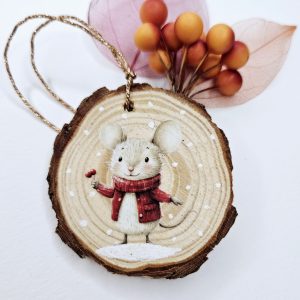 Add a touch of charm to your holiday season with our handmade wooden Christmas ornament featuring a cute woodland mouse..