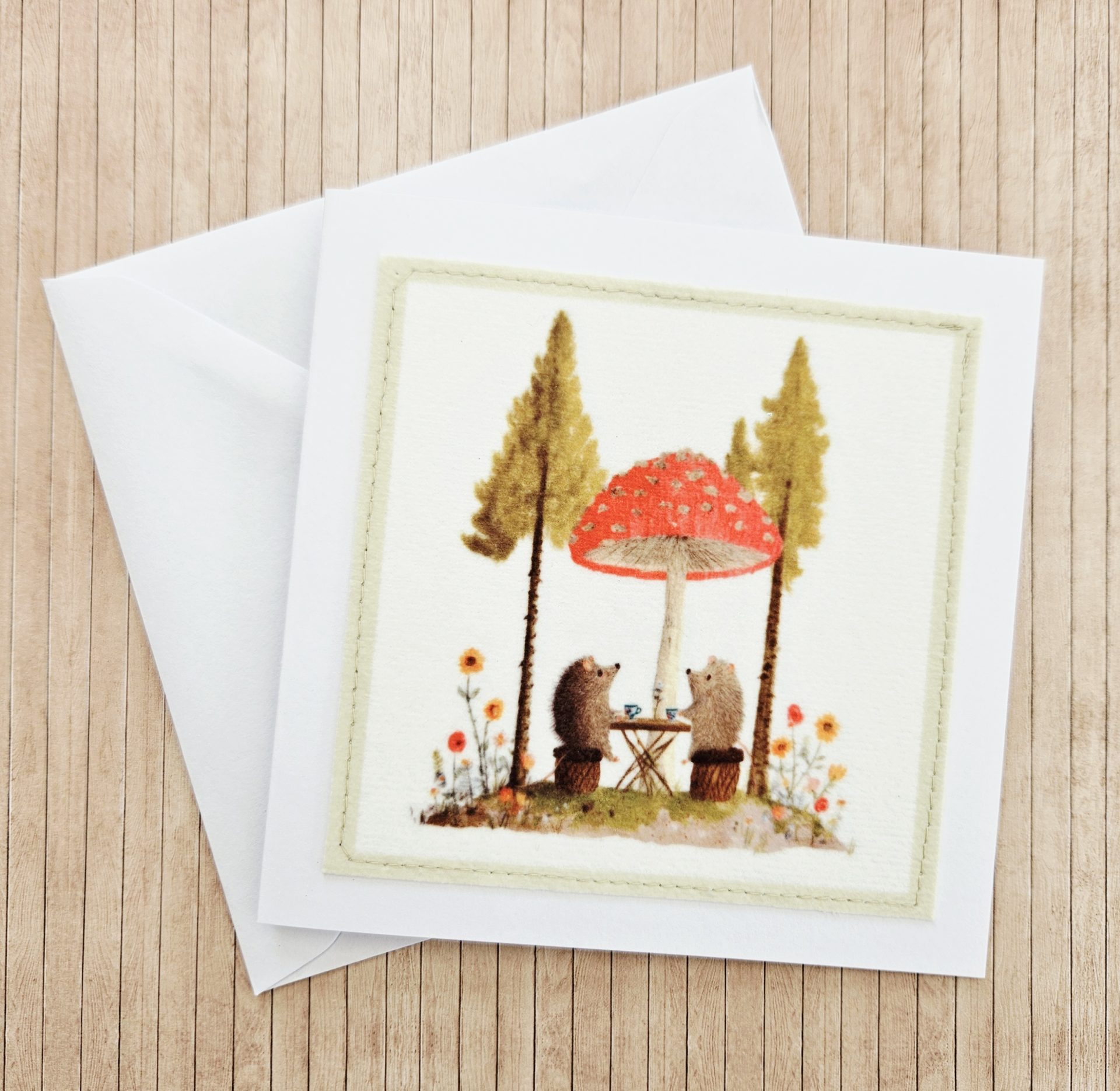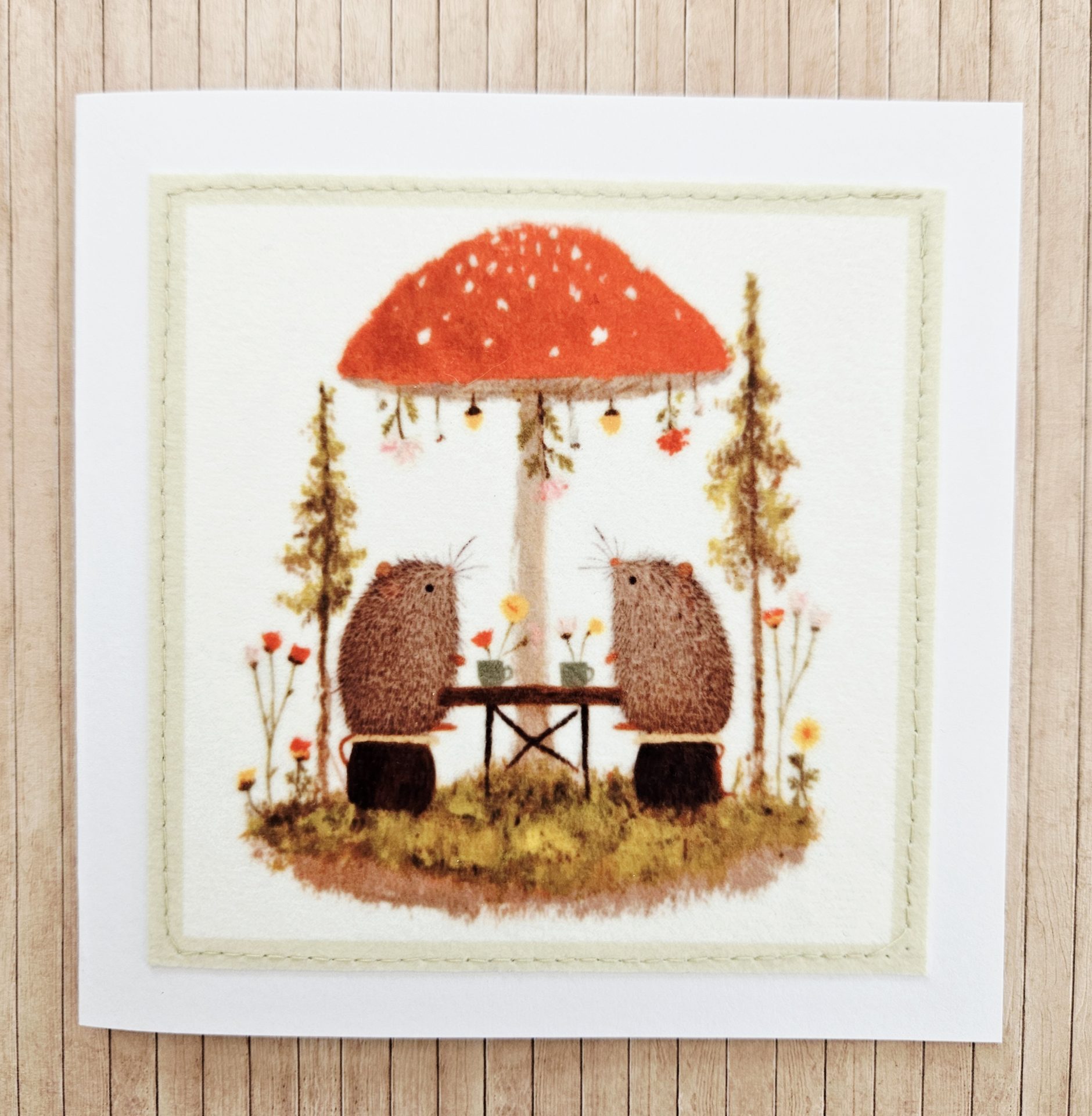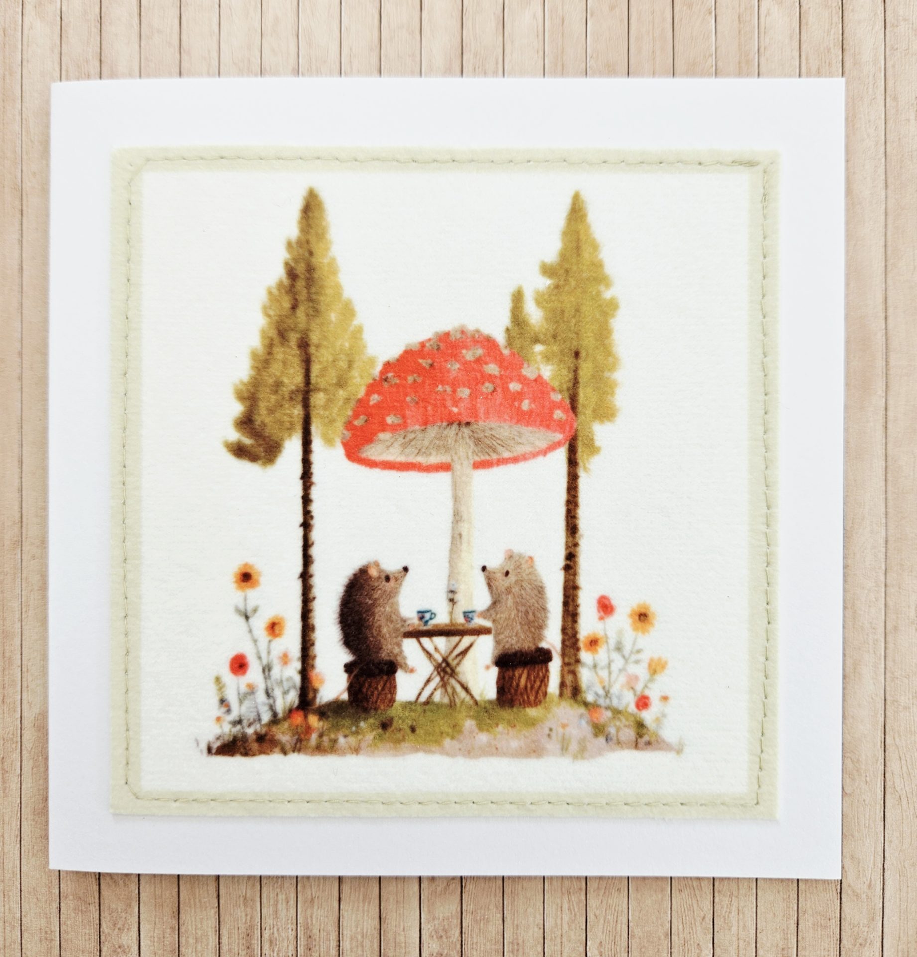 Bring a little woodland magic to someone’s day with this charming woodland mushroom greeting card set. It features sweet hedgehogs and mice enjoying a cosy tea party beneath bright red toadstools.